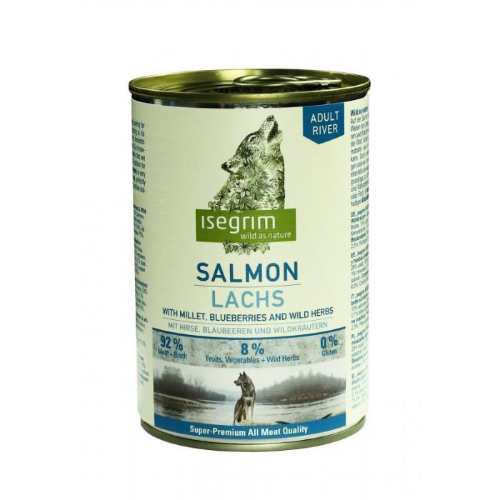 Вологий корм Isegrim Salmon Lachs із лососем, м’ясом свійської птиці, просом, чорницею та дикорослими травами – це повноцінний вологий корм для дорослих собак, створений з урахуванням природних потреб хижака та підтримки загального стану здоров’я. Формула базується на високоякісних тваринних білках і підходить собакам із чутливим травленням або схильністю до харчових реакцій. Поєднання свіжого лосося та м’яса свійської птиці забезпечує збалансоване надходження білків і жирів, необхідних для енергії, м’язового тонусу та блиску шерсті.