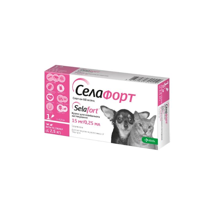 Селафорт Спот-он Краплі від бліх, кліщів і глистів для котів і собак вагою до 2,5 кг, 15 мг/0,25 мл, 1 піпетка