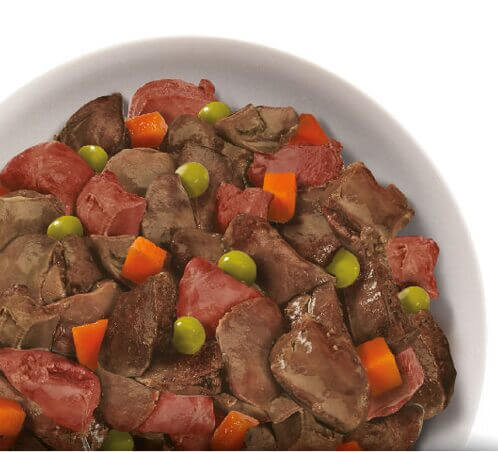 Склад: Куряча печінка (29%), курячі сердечка (11%), морква (9%), горох (7%), натуральний соус.