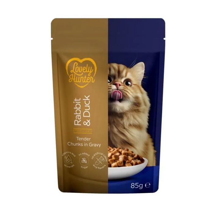 Харчування стерилізованих котів вимагає особливого балансу – менше калорій, більше уваги до сечовидільної системи та загального стану здоров’я. Вологий корм Lovely Hunter з кролятиною та качкою створений спеціально для підтримки доброго самопочуття стерилізованих котів щодня.