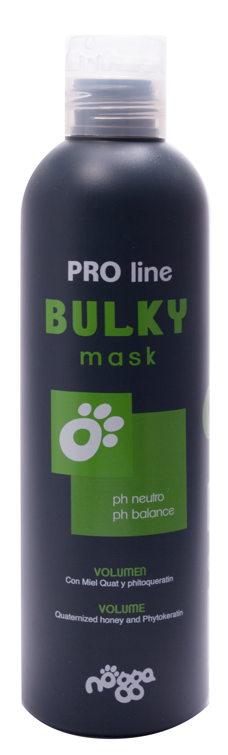 Зволожувальна маска Nogga Pro Line Bulky розроблена для надання ефекту екстра об’єму. Містить базові консистенційні компоненти та додані силіконові речовини. Застосовується щоразу, коли потрібно надати шерсті додатковий об’єм, має високу реструктуризуючу здатність.