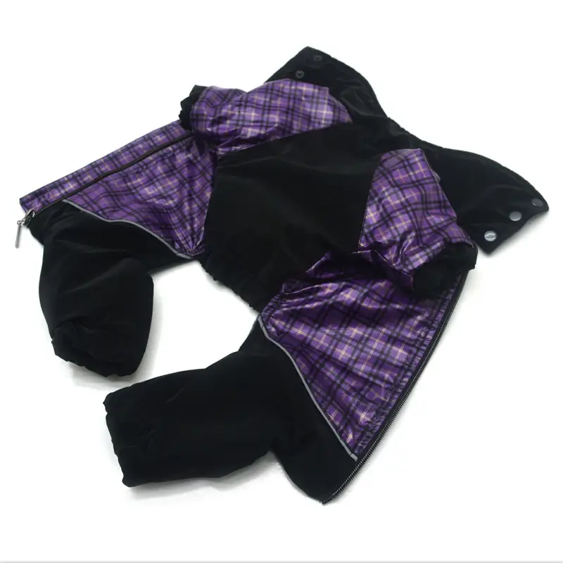 Вироби виготовлені з водонепроникної болоньї та має флісовий підклад. Комбінезон застібається на блискавку в області спини. Добре фіксується на тілі вихованця, щоб не зісковзувати під час руху, і має утеплені манжети на лапках, щоб не пропускати холод.