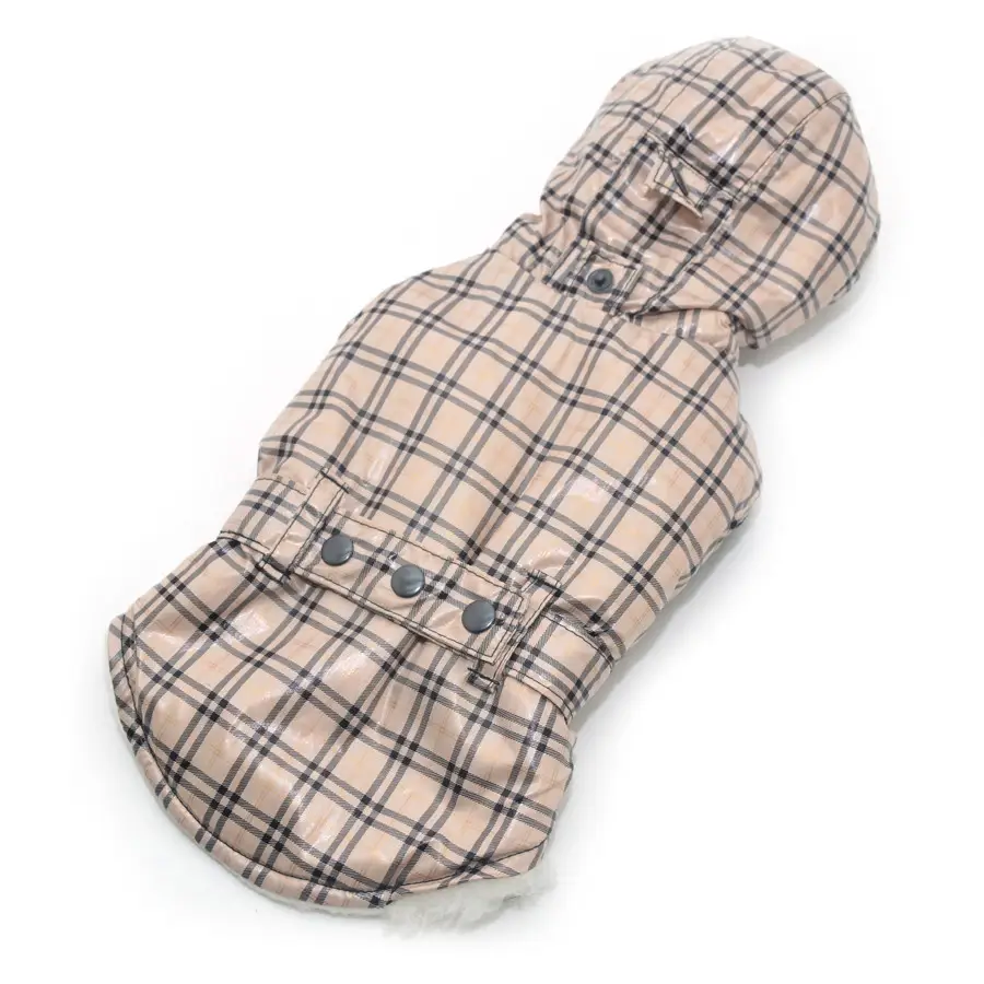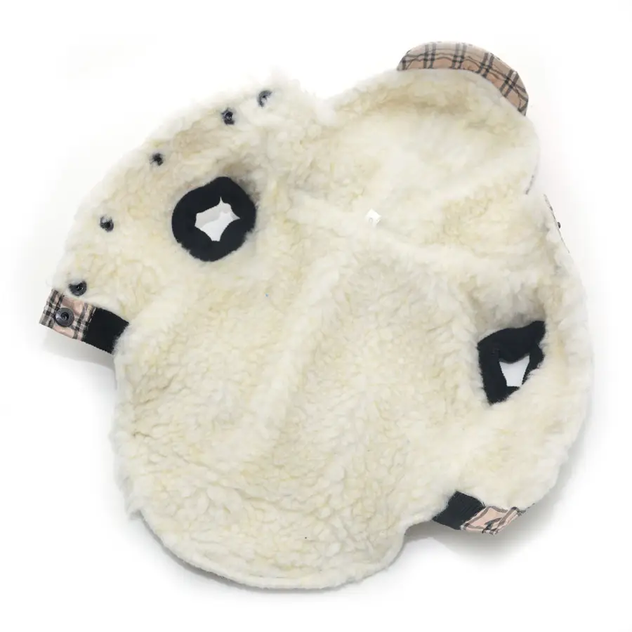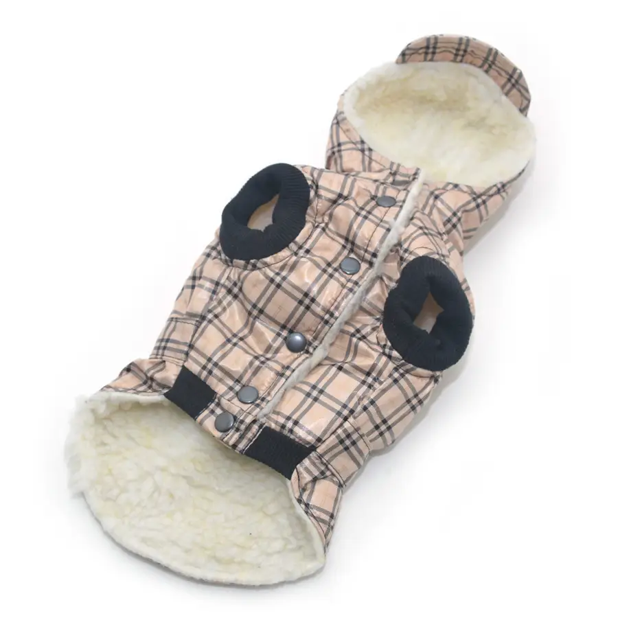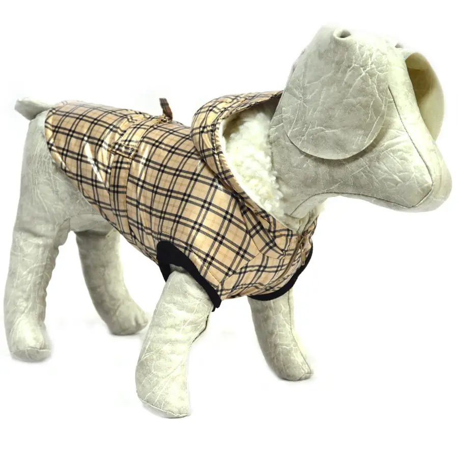 Вироби виготовлені зі щільної плащової тканини в клітинку та утеплений хутряним підкладом «овечкою». Жилети застібаються на кнопки в області грудки, мають утеплені манжети, щоб не пропускати холод і добре фіксуються на тілі вихованця, щоб не зісковзувати під час руху. Капюшон жилету також утеплений м’якою «овечкою». Жилетки дуже теплі та підходять для зимового періоду.