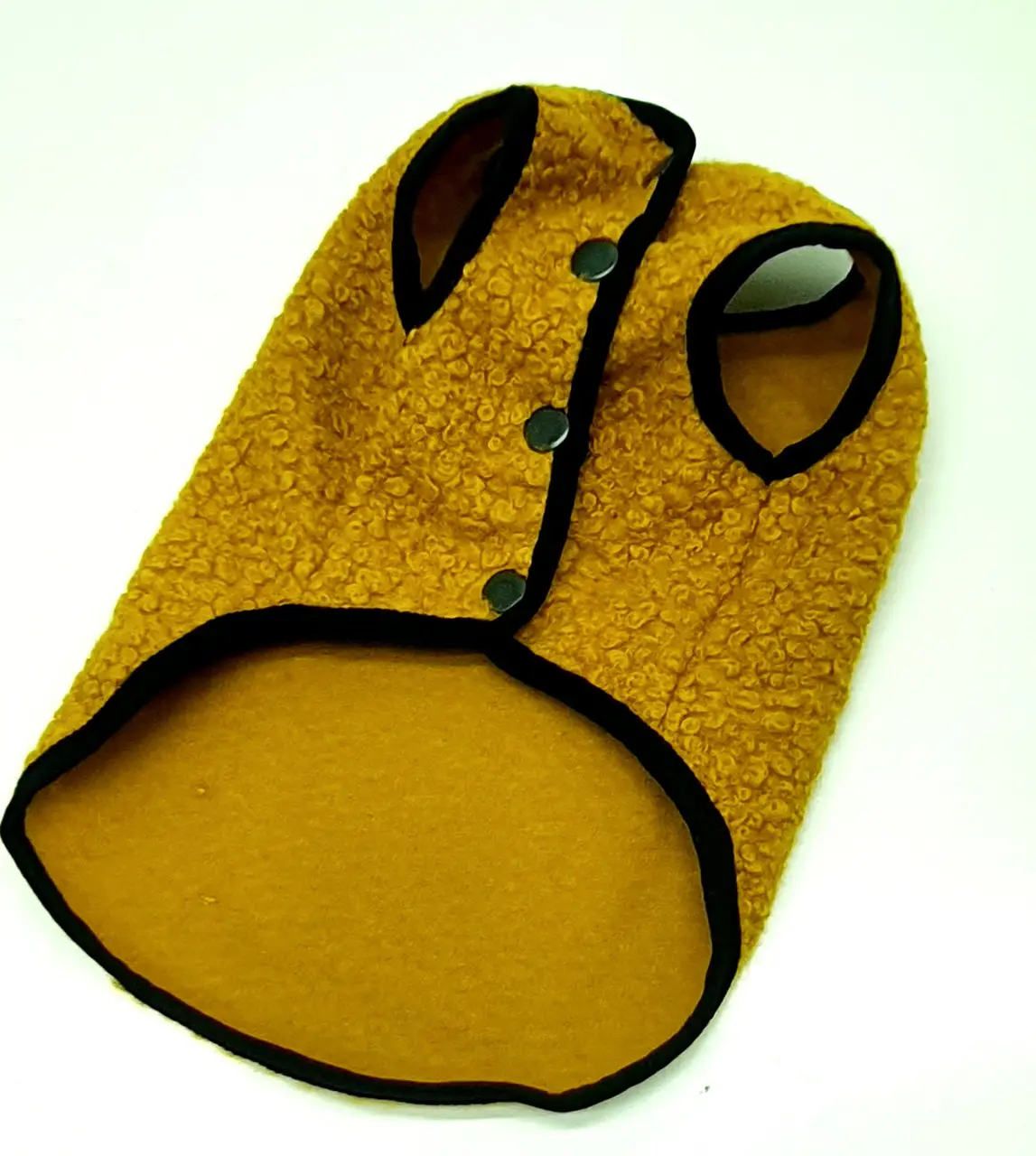 Вироби виготовлені з м’якої і теплої тканини баранчик, без підкладу. Жилети застібаються на кнопки в області грудей. Добре фіксуються на тілі вихованця, щоб не зісковзувати під час руху та не пропускати холод. Підійдуть на період міжсезоння (осінь, весна). На спинці – вишивка, що світиться в темряві.