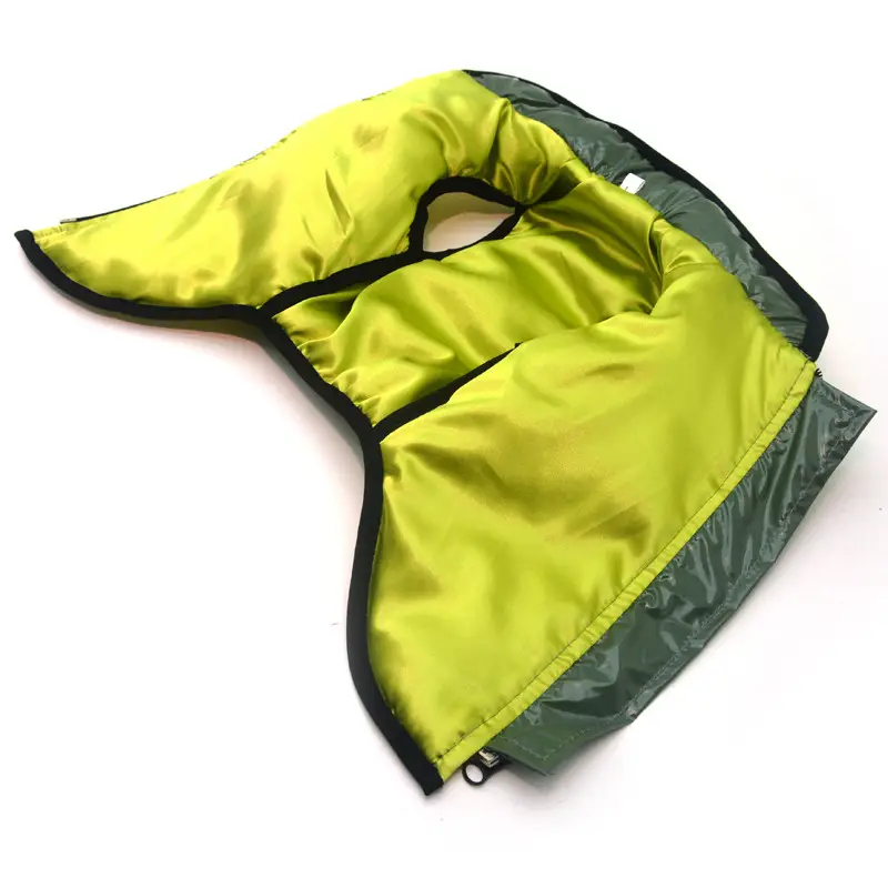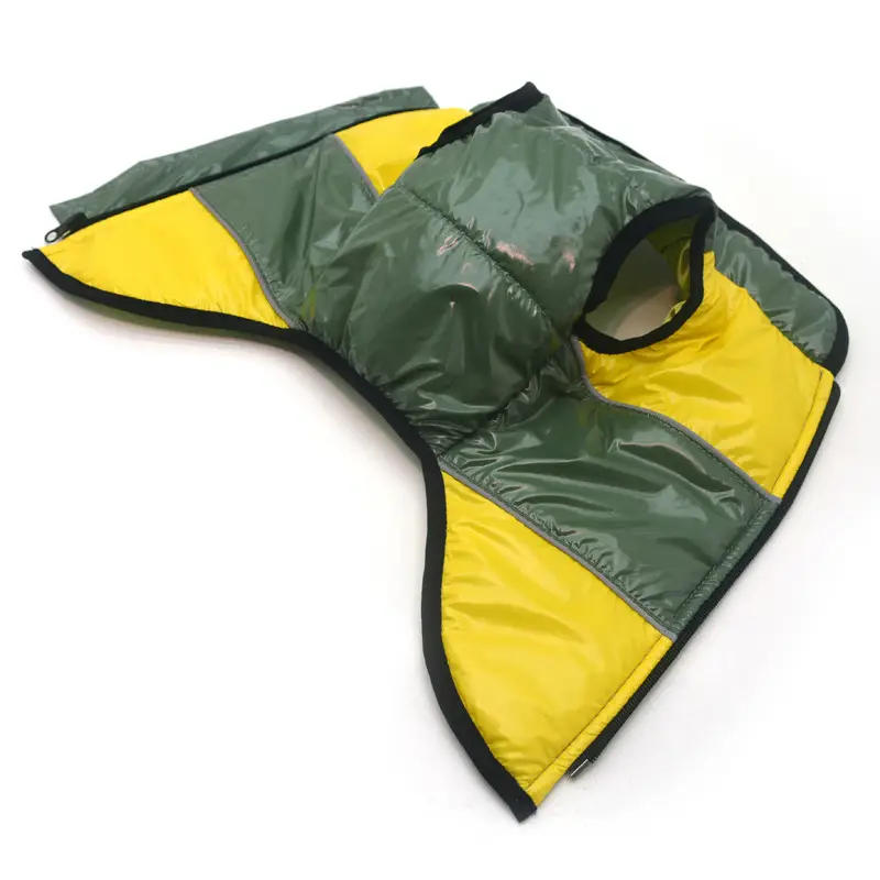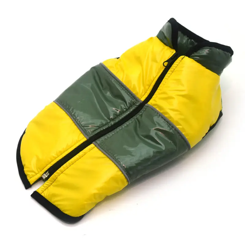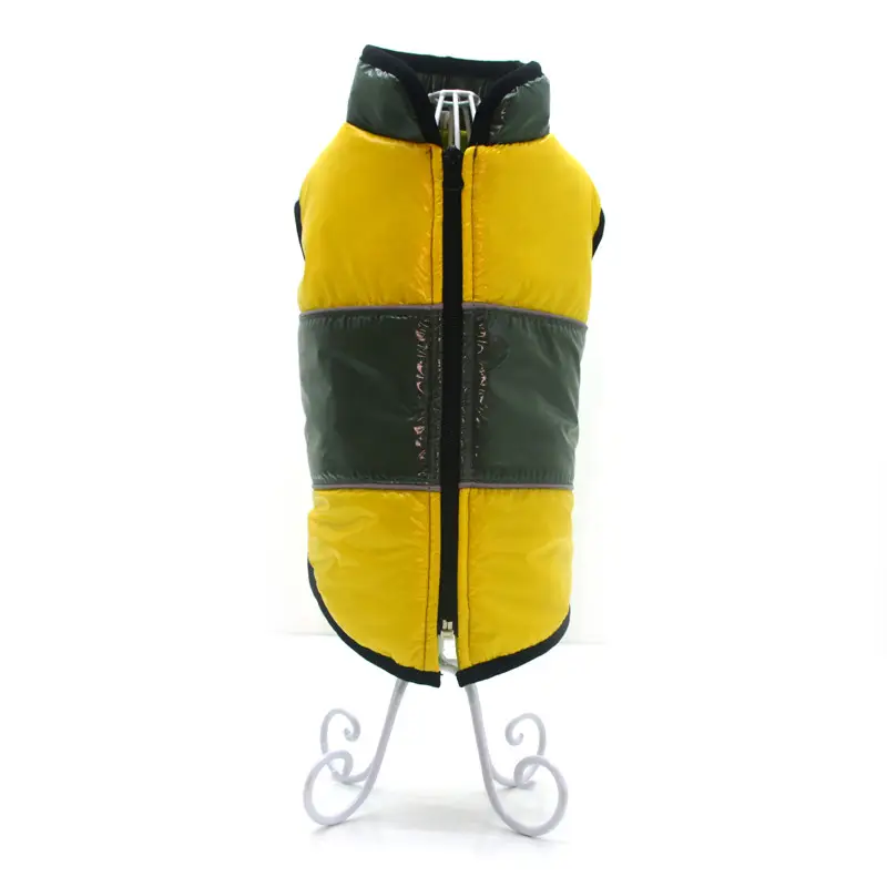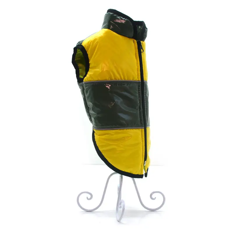 Вироби виготовлені зі щільної плащової тканини, утеплені синтепоном і мають прємний атласнй підклад. Жилети на грудці застібаються на блискавку в області спини. Добре фіксуються на тілі вихованця, щоб не зісковзувати під час руху та не пропускати холод. Жилети дуже теплі та підходять на зимовий період.