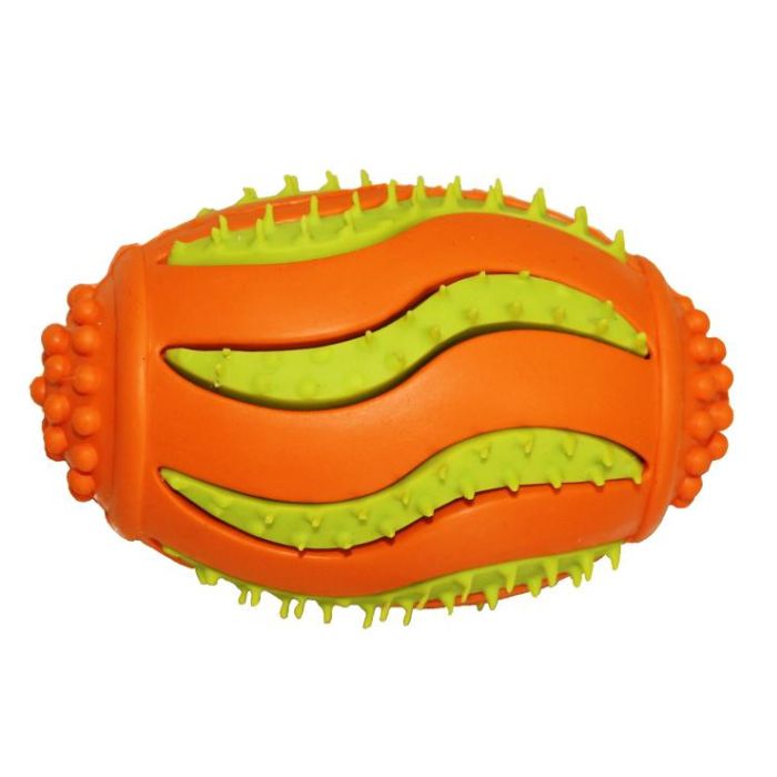 Іграшки для собак MISOKO з колекції SPORTY PAWS – ідеальні для енергійних улюбленців, які полюбляють жувати. Ця компактна іграшка у формі м’яча для регбі з рельєфними елементами на поверхні розроблена спеціально для активних собак: конструкція з гуми забезпечує безпечну гру, а текстурована поверхня стимулює ясна та підтримує гігієну ротової порожнини.