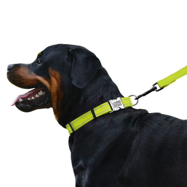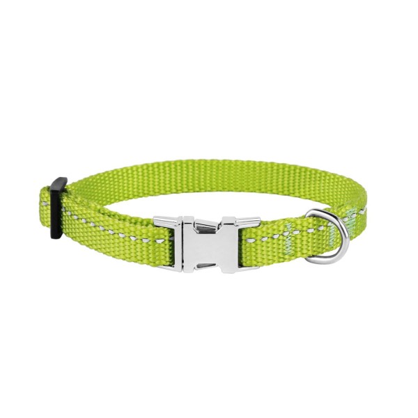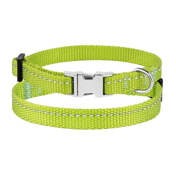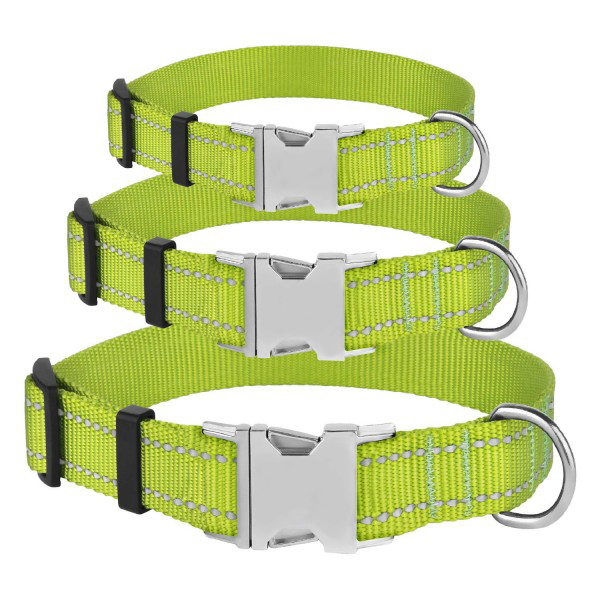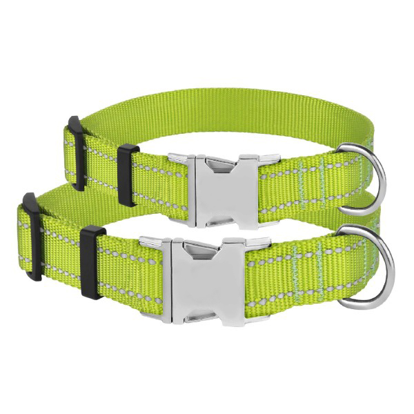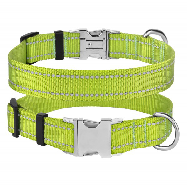 - Нашийник виконаний з вплетеними світловідбиваючими нитками та укомплектований міцною металевою пряжкою з можливістю нанесення гравіювання.