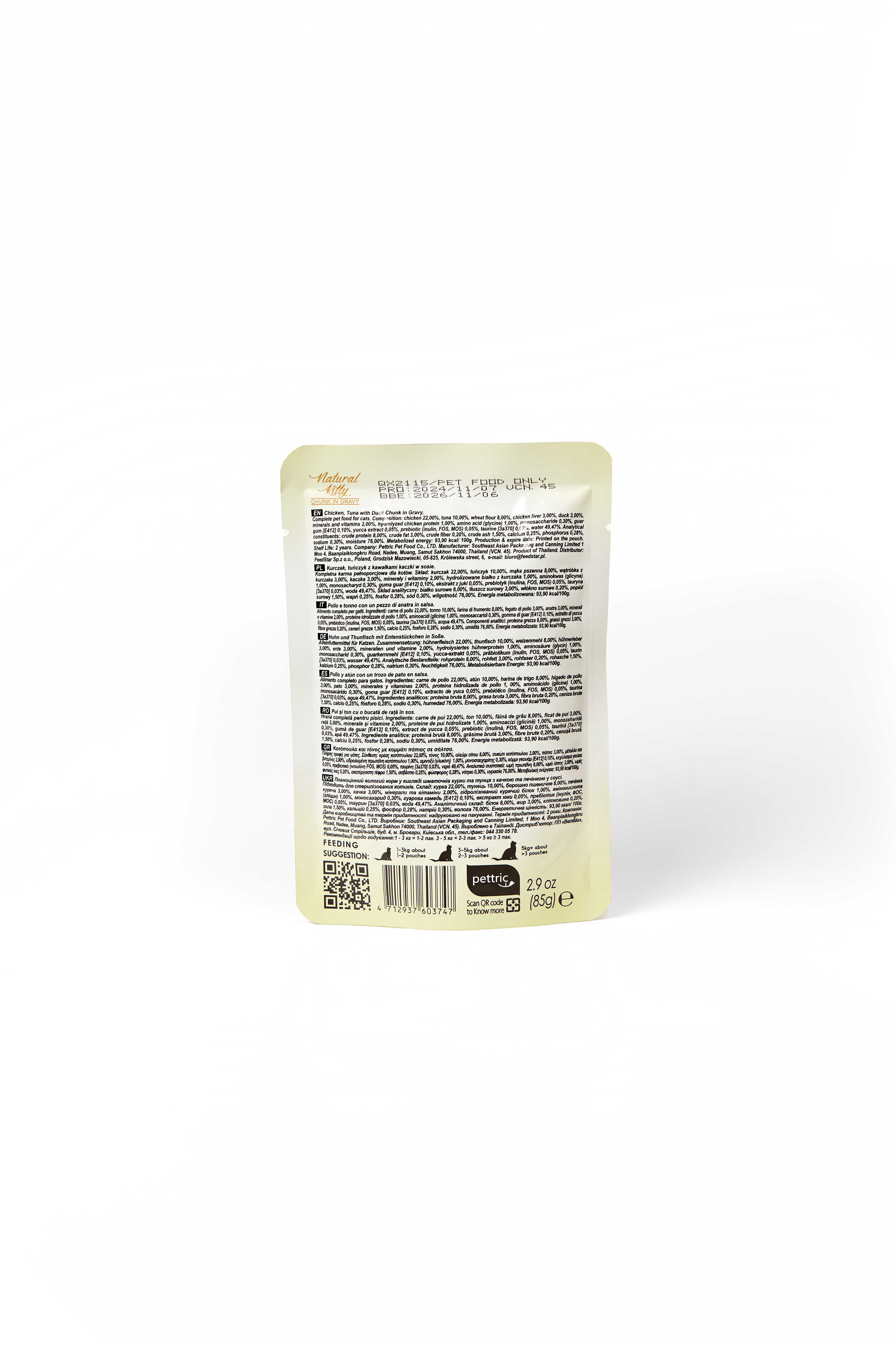 Вологий корм із шматочками курки та тунця з качкою та курячою печінкою в соусі Natural Kitty Chunk in Gravy Chicken, Tuna with Duck – це корисний та смачний раціон для котиків. Завдяки насиченому аромату та вишуканій текстурі цей вологий корм втілює бездоганну гармонію смаку та натурального аромату й стає фаворитом найвибагливіших муркотливих.