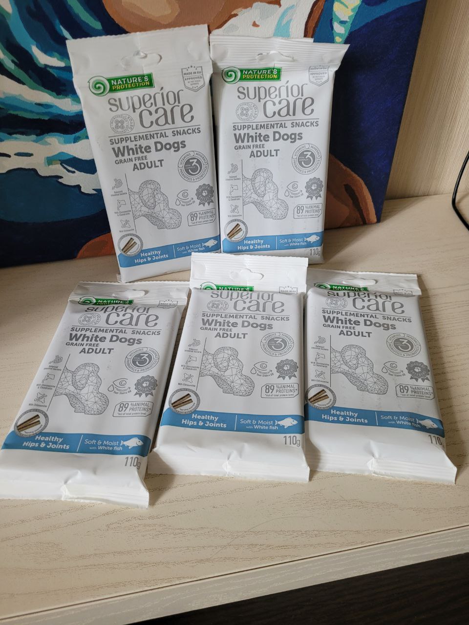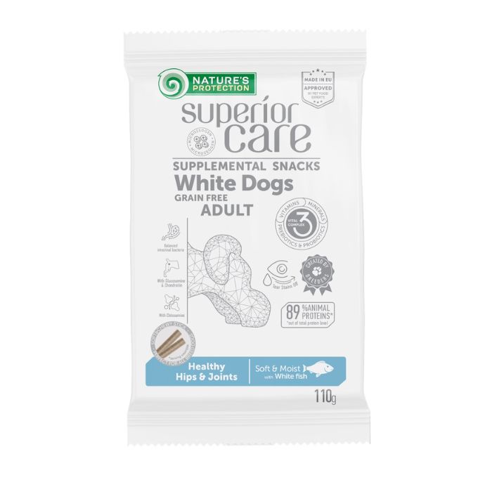 Nature's Protection Superior Care White Dogs Healthy hips & joints Беззернові ласощі для дорослих собак із білим забарвленням з білою рибою, 110 г
