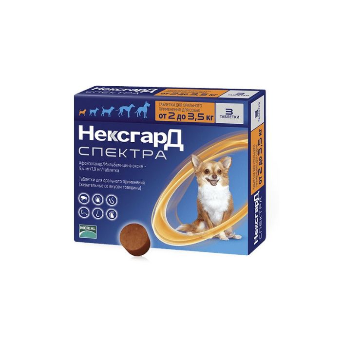 - 2-3,5 кг -; 1 таблетка NexGard Spectra 0,5 г (9 мг/2 мг)*;