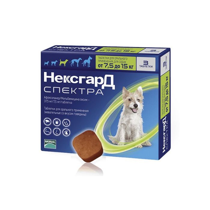 - 7,5-15 кг - 1 таблетка NexGard Spectra 2 г (38 мг/8 мг);