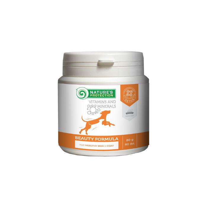 Біотин – це вітамін групи В, важливий для підтримки здоров'я шкіри, кігтів і шерсті. Він також необхідний для метаболізму вуглеводів, жирів і білків, які є важливими будівельними блоками для здорового росту тканин. Дріжджі, що входять до складу корму, містять незамінні амінокислоти та вітаміни, які сприяють здоров'ю шкіри та шерсті. Ці інгредієнти працюють разом, покращуючи стан шкіри та шерсті, а також сприяють оптимальній пігментації. Нестача цих елементів може спричинити екзему, свербіж, випадіння та ламкість шерсті, проблеми з пігментацією, сухість шкіри, а кігті можуть стати м'якими та ламкими. Добавка Nature's Protection Beauty Formula підходить для собак і є зручним та ефективним варіантом для підтримки здорової та красивої шерсті й загального стану здоров'я улюбленця.