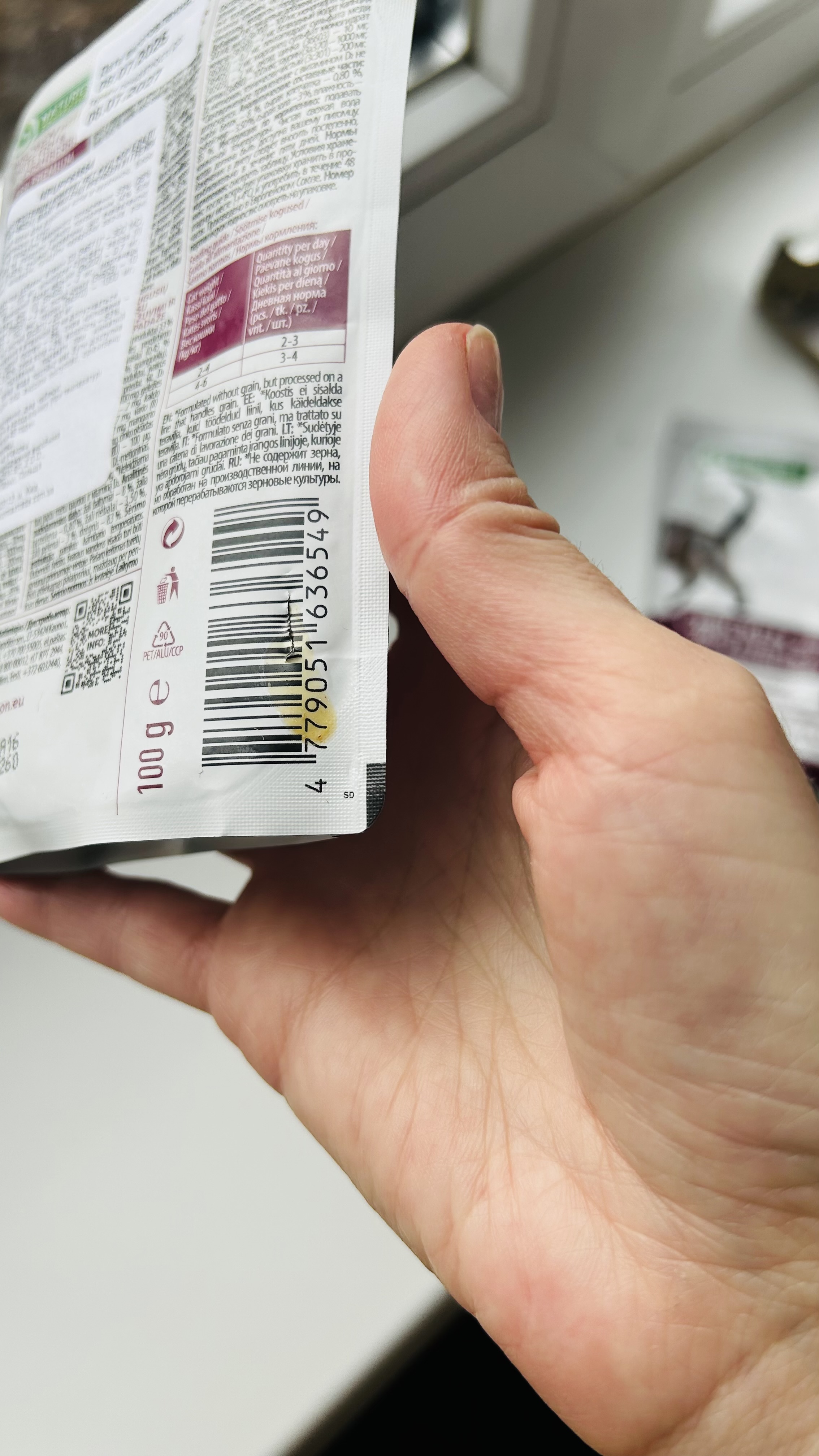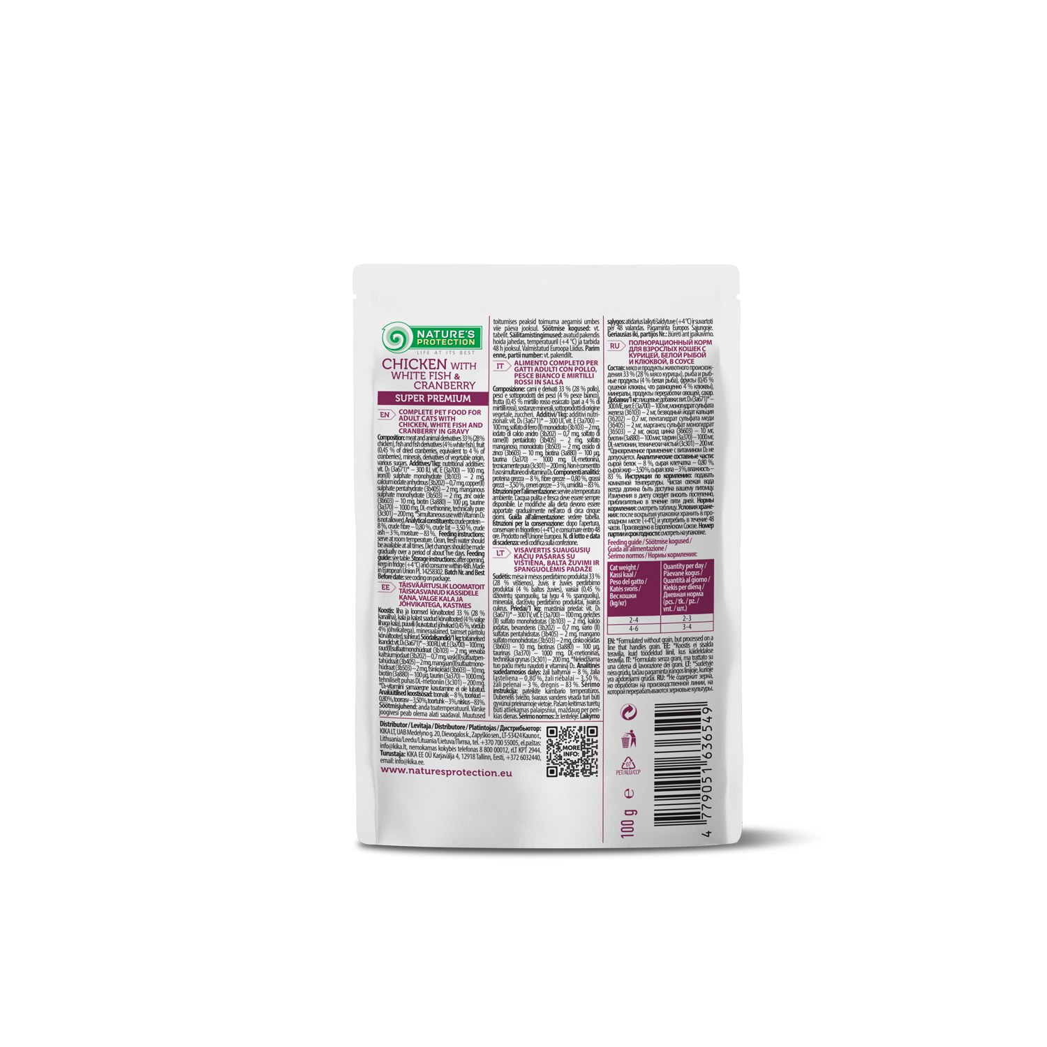 Склад компонентів, допоміжних речовин: м'ясо та продукти тваринного походження – 33 % (28 % курятина), риба та продукти з риби (4 % біла риба), фрукти (0,45 % сушеної журавлини, що еквівалентно 4 % журавлини), мінерали, похідні рослинного походження, різні види цукру.