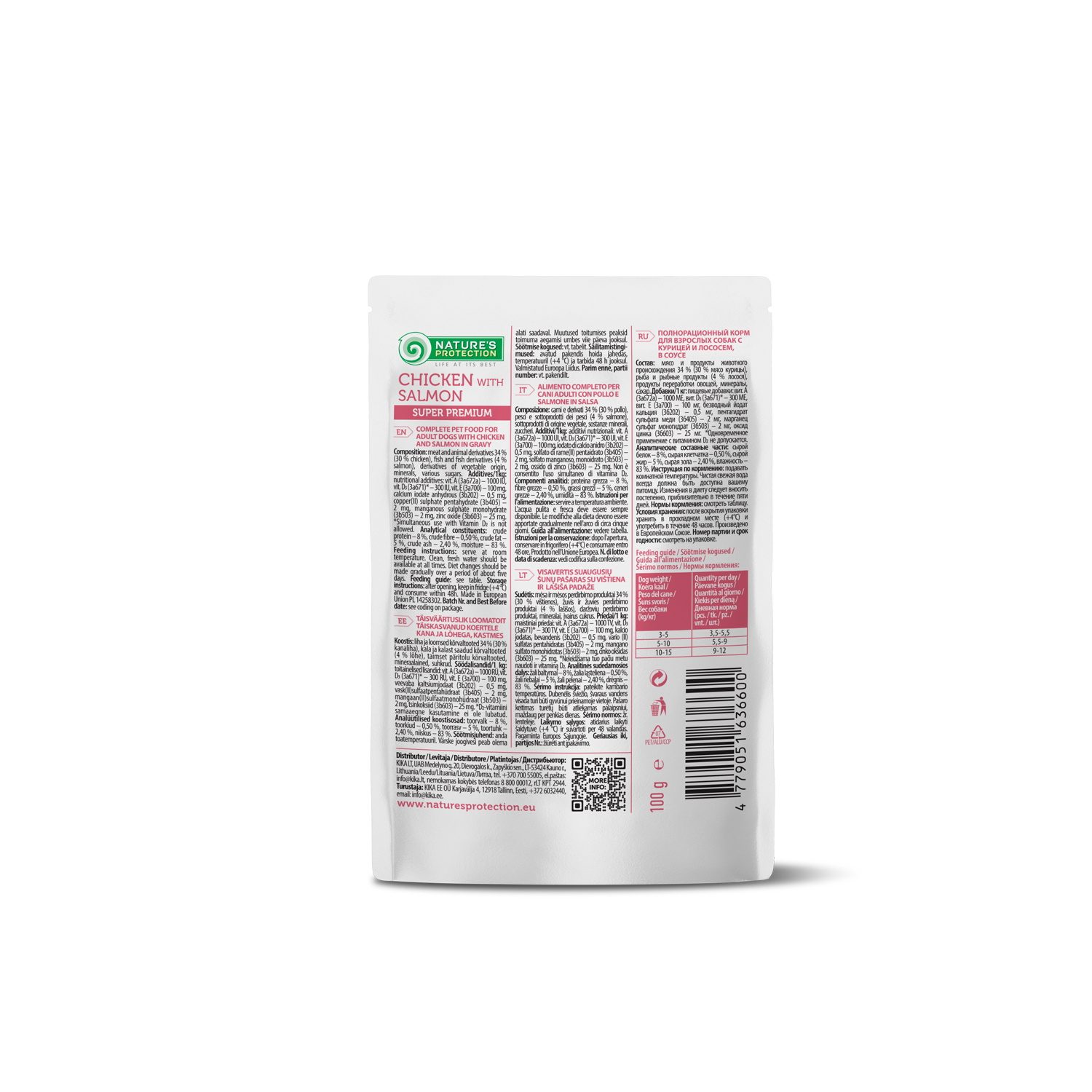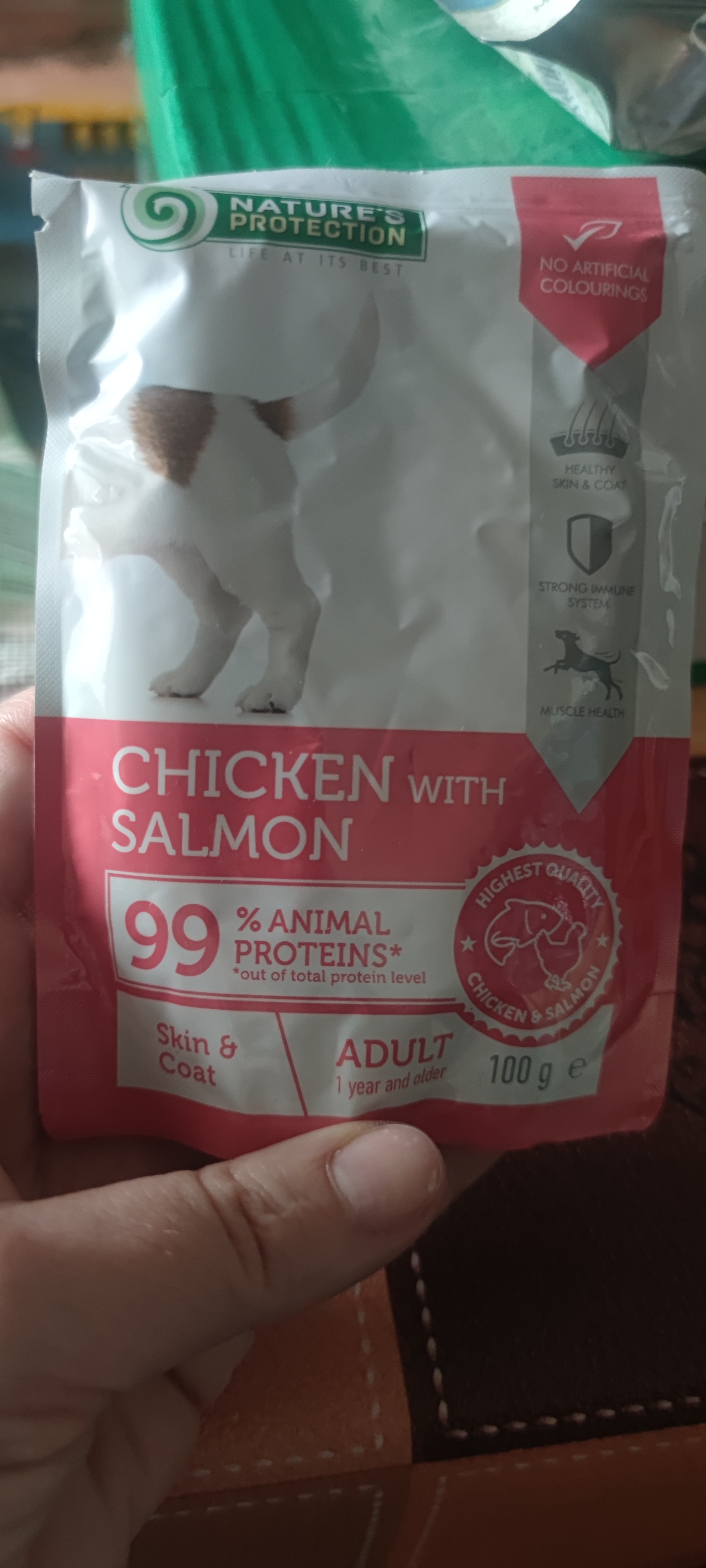 Nature’s Protection Skin & Coat with Chicken and Salmon – це супер-преміум повнораціонний вологий корм для дорослих собак із куркою та лососем у смачному соусі, доповнений мінералами. Спеціальна формула сприяє підтримці здоров’я шкіри та сяючої шерсті, розвиток м’язів з природною системою захисту. Основне джерело білка в цьому продукті – високоякісні курка та лосось, що мають високу харчову цінність. Корм – м’який і легко пережовується, а склад м’яса та соусу – легкозасвоюваний. Вологий корм Nature’s Protection розроблений із урахуванням різних потреб молодих і дорослих собак, стане чудовим доповненням раціону в поєднанні з сухим кормом. Спеціальна рецептура дає змогу зберігати натуральний смак і апетитний аромат. Вологий корм, приготований в оптимальному обсязі, зручно використовувати в домашніх умовах, під час подорожей і виставок. Продукт не містить свинини – важко засвоюваний м’ясний протеїн для домашніх тварин.