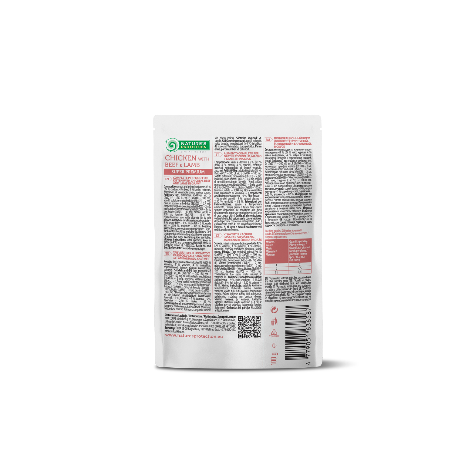 Nature’s Protection Healthy Growth, Chicken with Beef & Lamb – це супер-преміум повнораціонний вологий корм для кошенят із куркою, яловичиною та ягнятиною у смачному соусі, доповнений мінералами. Спеціальна формула сприяє зміцненню імунної системи кошенят, збагачена необхідними мінералами для здоров’я та краси шкіри й шерсті, а також розвитку кістково-м’язової статури. Основне джерело білка в цьому продукті – високоякісні білки тваринного походження, що мають високу харчову цінність. Корм – м’який і легко пережовується, а склад м’яса та соусу – легкозасвоюваний. Вологий корм Nature’s Protection розроблений із урахуванням різних потреб молодих і дорослих кішок. Спеціальна рецептура дає змогу зберігати натуральний смак і апетитний аромат. Вологий корм, приготований в оптимальному обсязі, зручно використовувати в домашніх умовах, під час подорожей і виставок. Продукт не містить свинини – важкозасвоюваного інгредієнту для домашніх тварин.