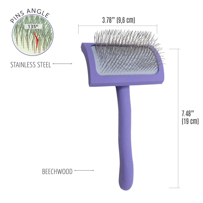 Штифти щітки міцні та дуже м'які, з кутом вигину, який запобігає подряпинам шкіри вихованця та робить розчесану шерсть м'якою та пухнастою. Крім того, штифти легко рухаються та розчісують шерсть, не пошкоджуючи її.