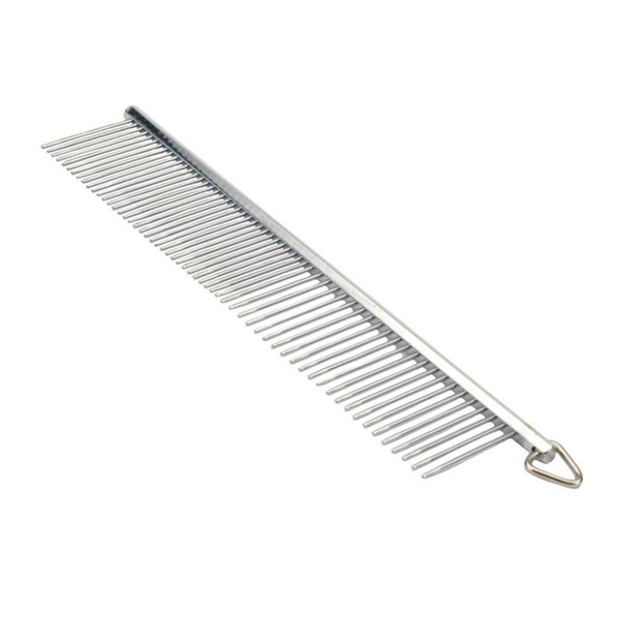 - Гребінець виготовлений з високоякісного металу, зубці міцні, стійкі до корозії та мають закруглені кінчики, що запобігають травмам шкіри під час розчісування. Конструкція комбінує зубці з різним кроком: рідкісні зубці ідеальні для попереднього розчісування густої або заплутаної шерсті, часті зубці – для фінішного вирівнювання шерсті, обробки мордочки, вусів і створення об’єму. Завдяки цьому один інструмент повністю замінює кілька окремих гребінців, економлячи час та зусилля під час догляду.