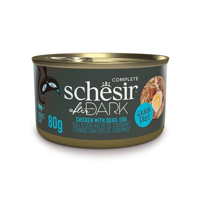 Вологий корм для котів Schesir After Dark виготовлений із ніжного курячого філе зі шматочками курячих сердець, печінки, шлунків і перепелиним яйцем у бульйоні. Збагачений вітамінами, мінералами та таурином для підтримки здоров’я дорослого кота. Корм готується мінімально обробленим способом, що зберігає природний смак і поживну цінність інгредієнтів.