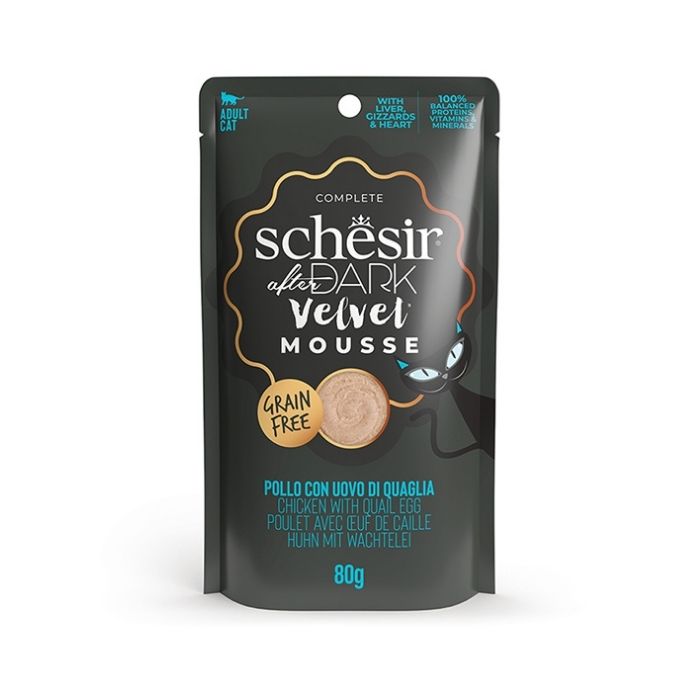 Вологий корм для котів Schesir After Dark мус виготовлений із ніжного курячого філе зі шматочками курячих сердець, печінки, шлунків і перепелиним яйцем у текстурі легкого мусу. Збагачений вітамінами, мінералами й таурином для підтримки здоров’я дорослого кота. Корм готується мінімально обробленим способом, що зберігає природний смак і поживну цінність інгредієнтів.