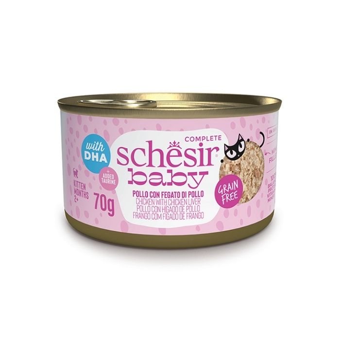 Вологий корм для кошенят Schesir Baby виготовлений із високоякісної курятини та курячої печінки у формі дрібно нарізаних шматочків у бульйоні. Збагачений вітамінами, мінералами, DHA й таурином для підтримки росту та розвитку кошенят. Корм готується мінімально обробленим способом, що зберігає природний смак і поживну цінність інгредієнтів.