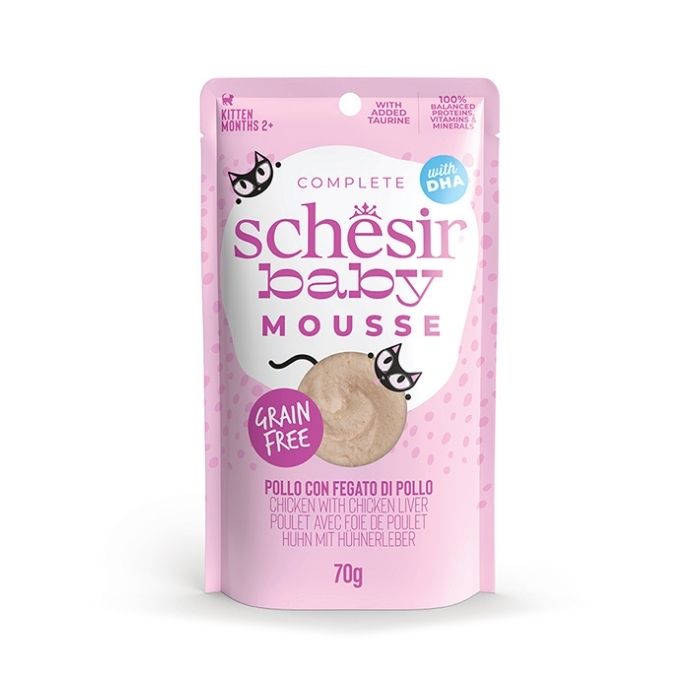 Вологий корм для кошенят Schesir Baby виготовлений із високоякісної курятини та курячої печінки у формі ніжного мусу. Збагачений вітамінами, мінералами, DHA й таурином для підтримки росту та розвитку кошенят. Корм готується мінімально обробленим способом, що зберігає природний смак і поживну цінність інгредієнтів.