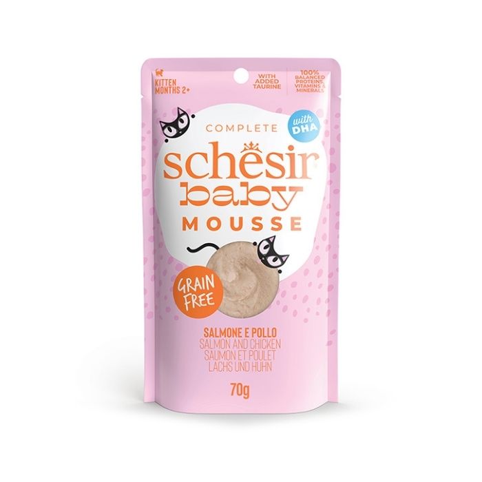 Вологий корм для кошенят Schesir Baby виготовлений із високоякісного філе лосося, курятини та курячої печінки у формі ніжного мусу. Збагачений вітамінами, мінералами, DHA й таурином для підтримки росту та розвитку кошенят. Корм готується мінімально обробленим способом, що зберігає природний смак і поживну цінність інгредієнтів.