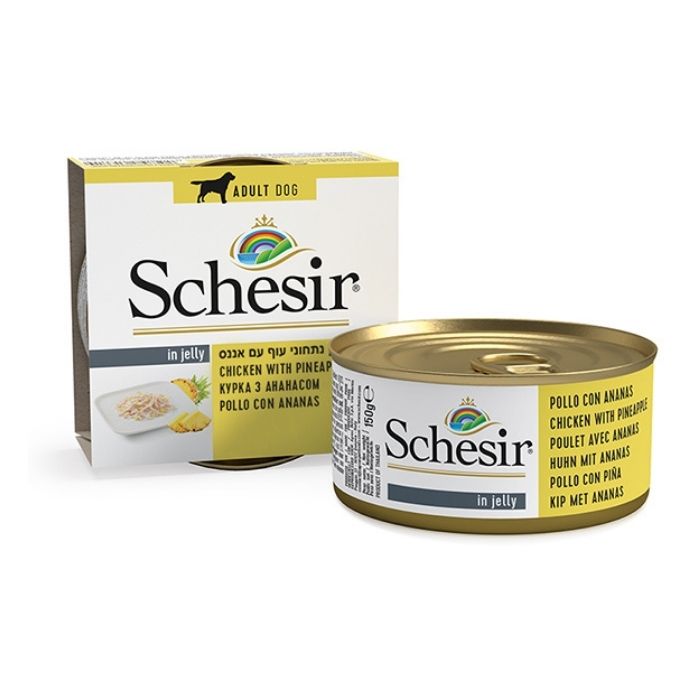 Вологий корм для дорослих собак Schesir Chicken with Pineapple виготовлений із добірного філе курки з додаванням шматочків стиглого ананаса. Корм готується на пару та обробляється вручну, що дозволяє зберегти природний смак і поживну цінність інгредієнтів.