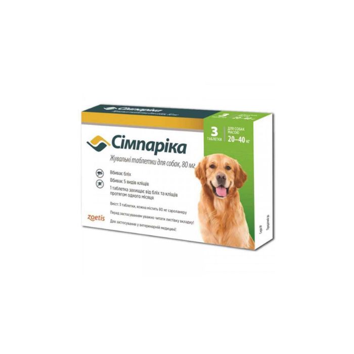 СІМПАРІКА Таблетки від бліх та кліщів для собак 20-40 кг (80мг) 1 таблетка