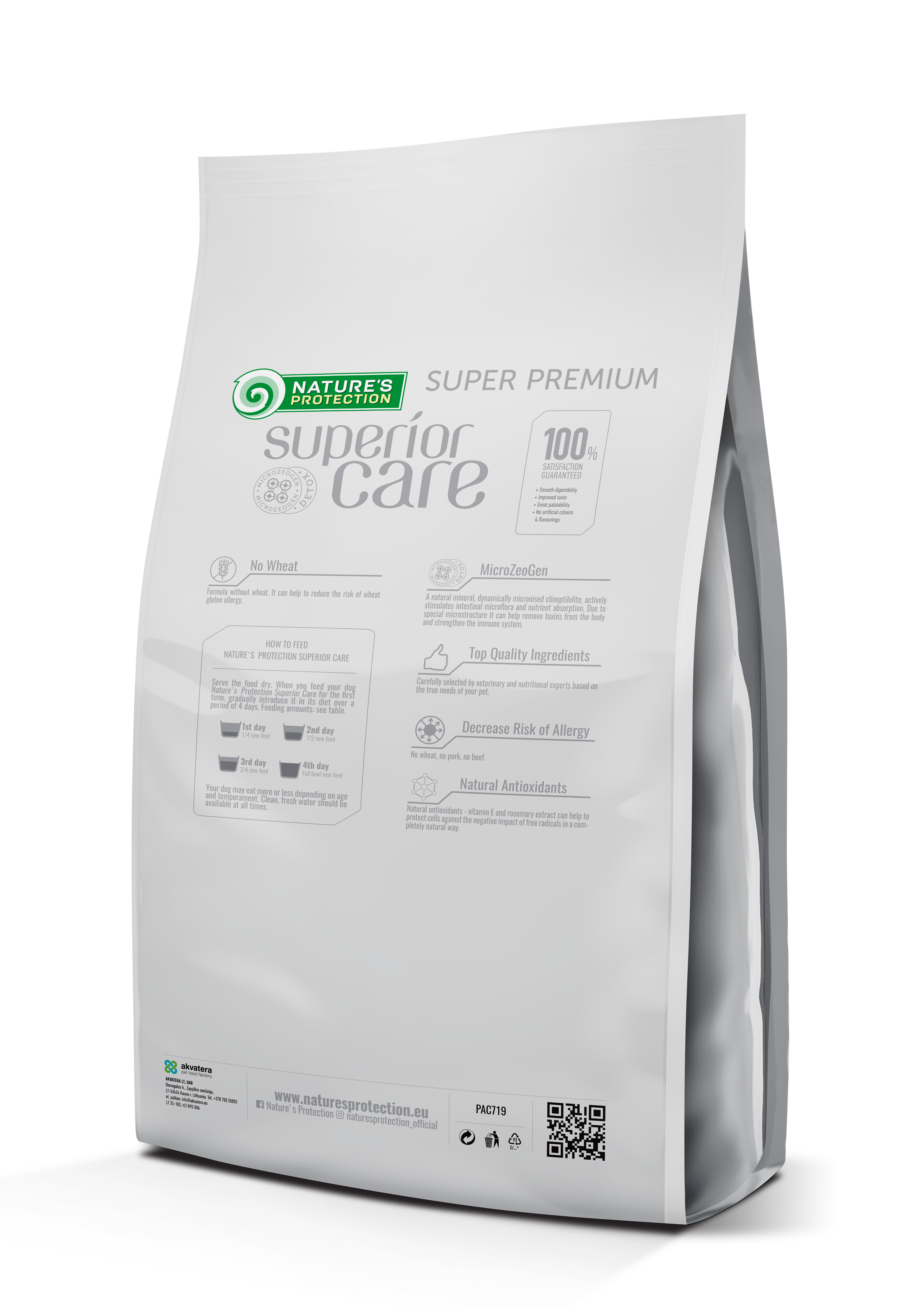 Nature’s Protection Superior Care – лінійка сухих кормів для собак Супер Преміум класу, відома інноваційними інгредієнтами та розроблена з застосуванням провідних технологій для здорового харчування домашніх тварин. Цей повноцінний корм для собак містить джерела білка та інгредієнти тільки найвищої якості.