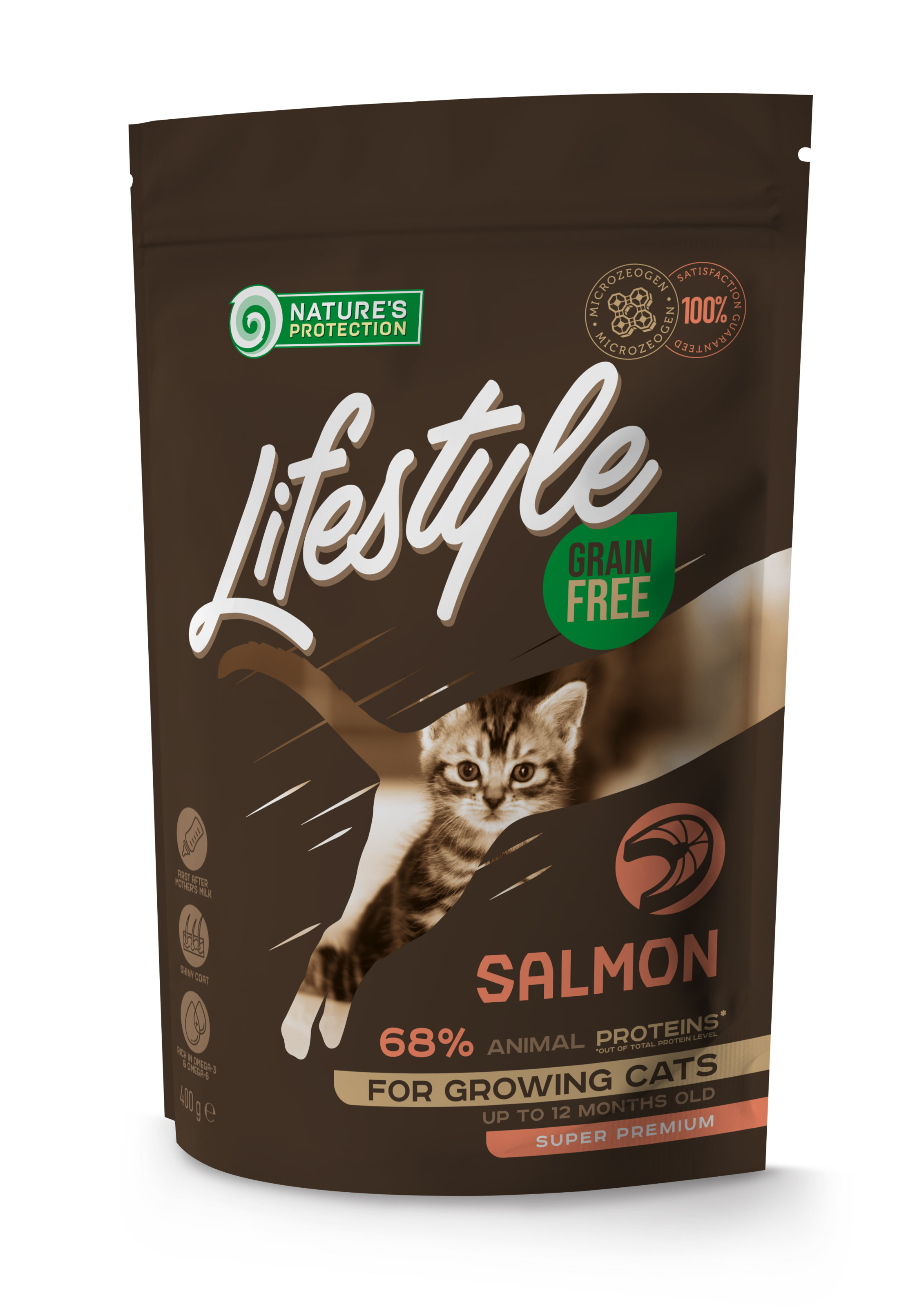 Nature's Protection Lifestyle Grain Free з лососем для кошенят – це повнораціонний, збалансований сухий корм супер преміум класу з високоякісними джерелами білка та сировиною. Цей корм спеціально розроблений для зростаючих кошенят, щоб допомогти їм подолати складний період відлучення від материнського молока в оптимальному стані та забезпечити гарний старт у житті. Він доповнений інноваційними інгредієнтами, які не містять глютену та забезпечують ідеальну продуктивність для гарного самопочуття улюбленця. Повноцінний склад цього сухого корму підходить не лише для кошенят, що ростуть, але й для вагітних і годуючих кішок, забезпечуючи їх необхідною енергією для росту та здоров'я.