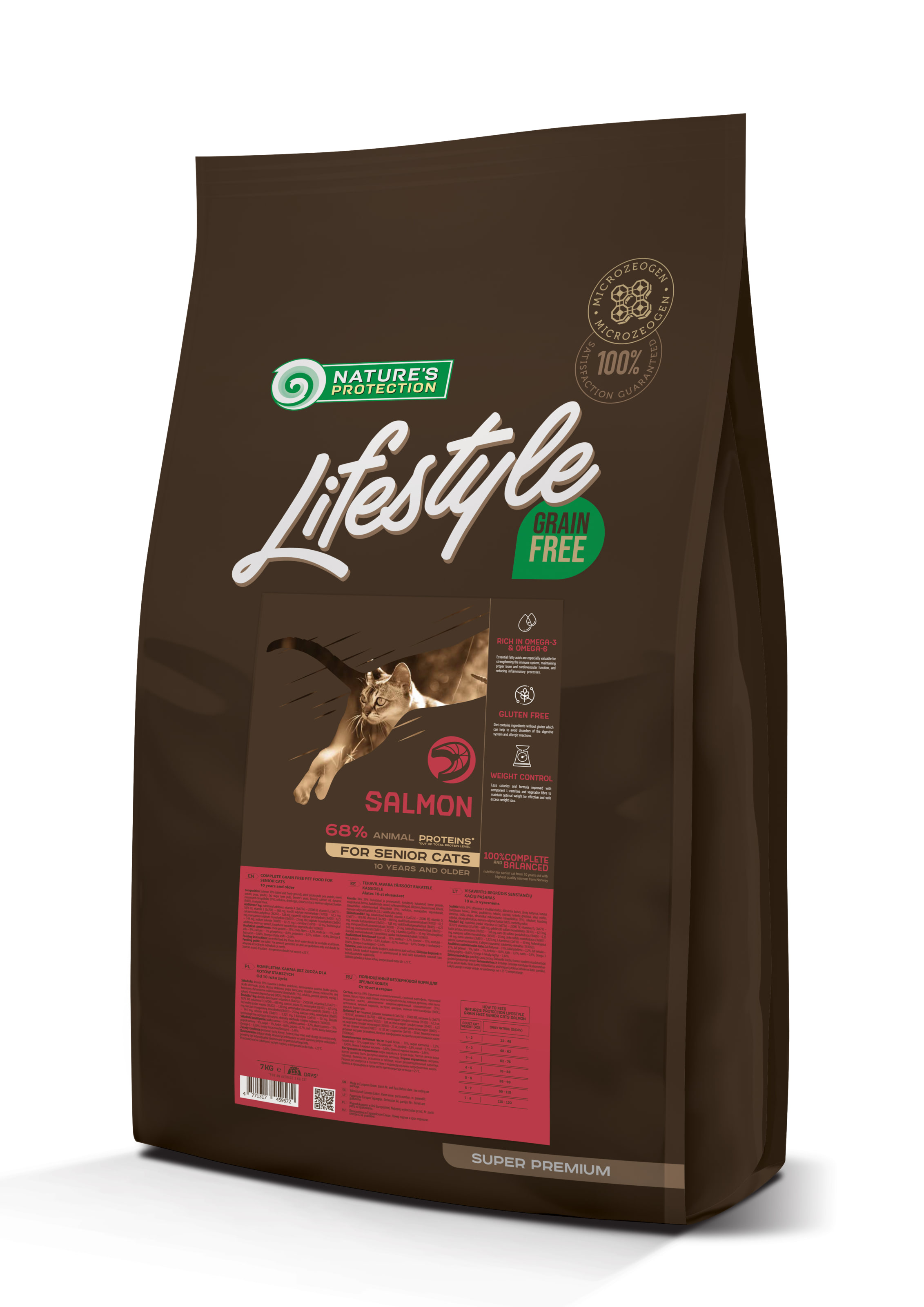 Nature's Protection Lifestyle Grain Free з лососем для літніх котів – це повноцінний збалансований сухий корм супер преміум класу з високоякісними джерелами білка та сировиною. Спеціально розроблений для котів від 10 років і старше, для підтримки здоров'я кісток і суглобів улюбленців. Він містить менше калорій і доповнений інноваційними інгредієнтами, які допомагають підтримувати оптимальну вагу. Повноцінний склад цього сухого корму не тільки забезпечить вашого вихованця всіма необхідними поживними речовинами, але й гарантує ідеальне засвоєння та підтримку здоров’я сечовидільної системи.