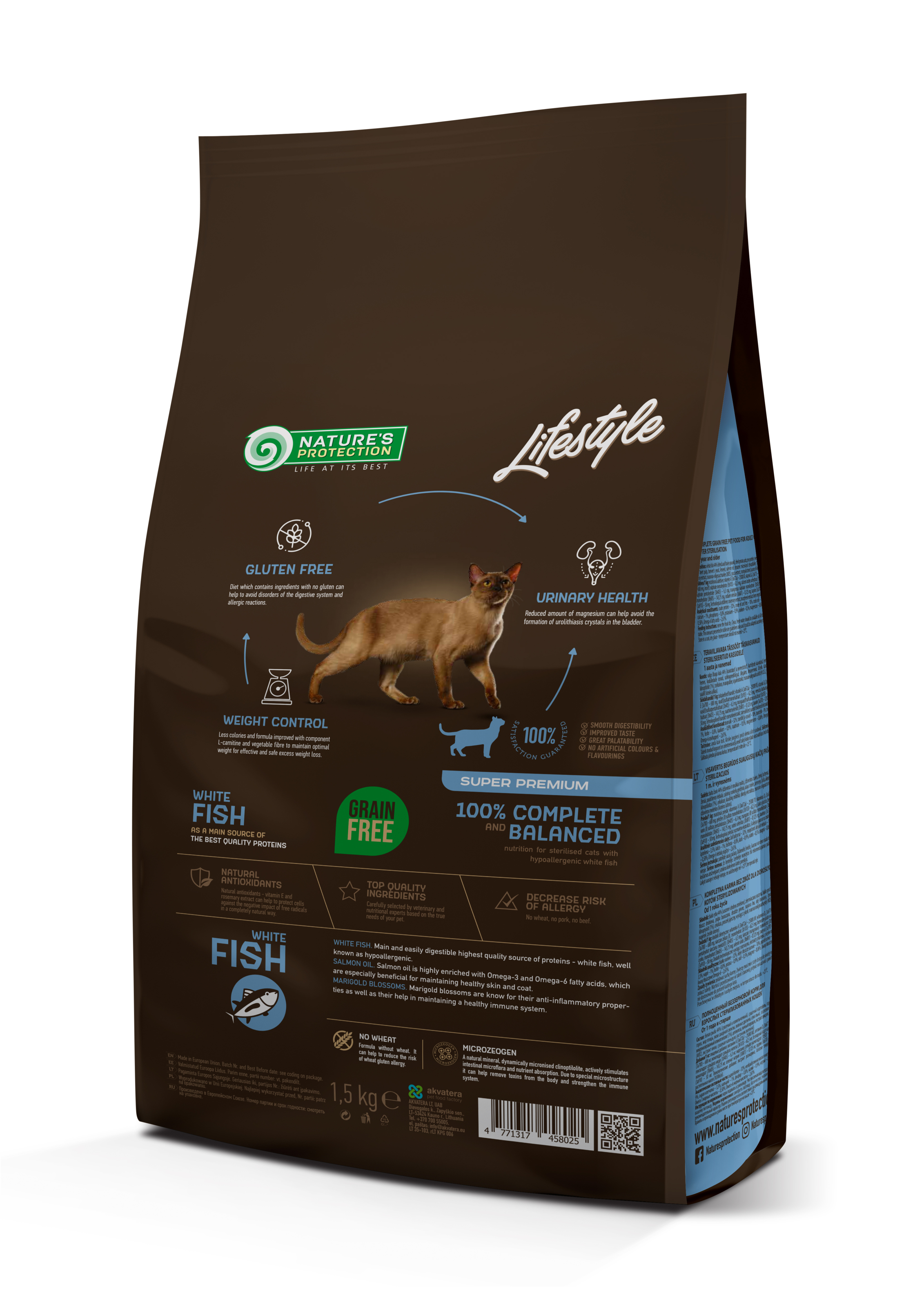 Nature's Protection Lifestyle Sterilised White fish Сухий беззерновий корм для стерилізованих котів з білою рибою, 1,5 кг
