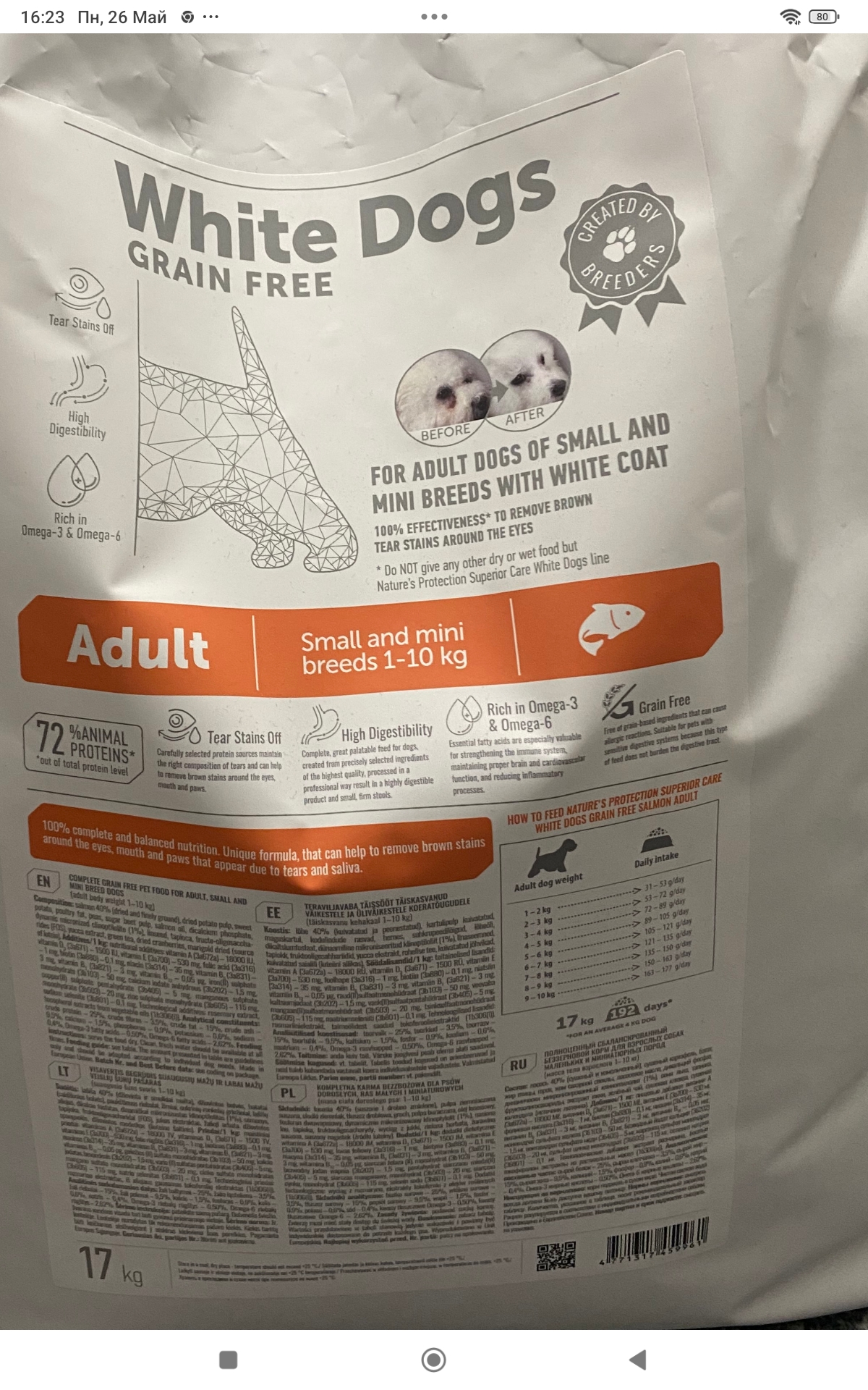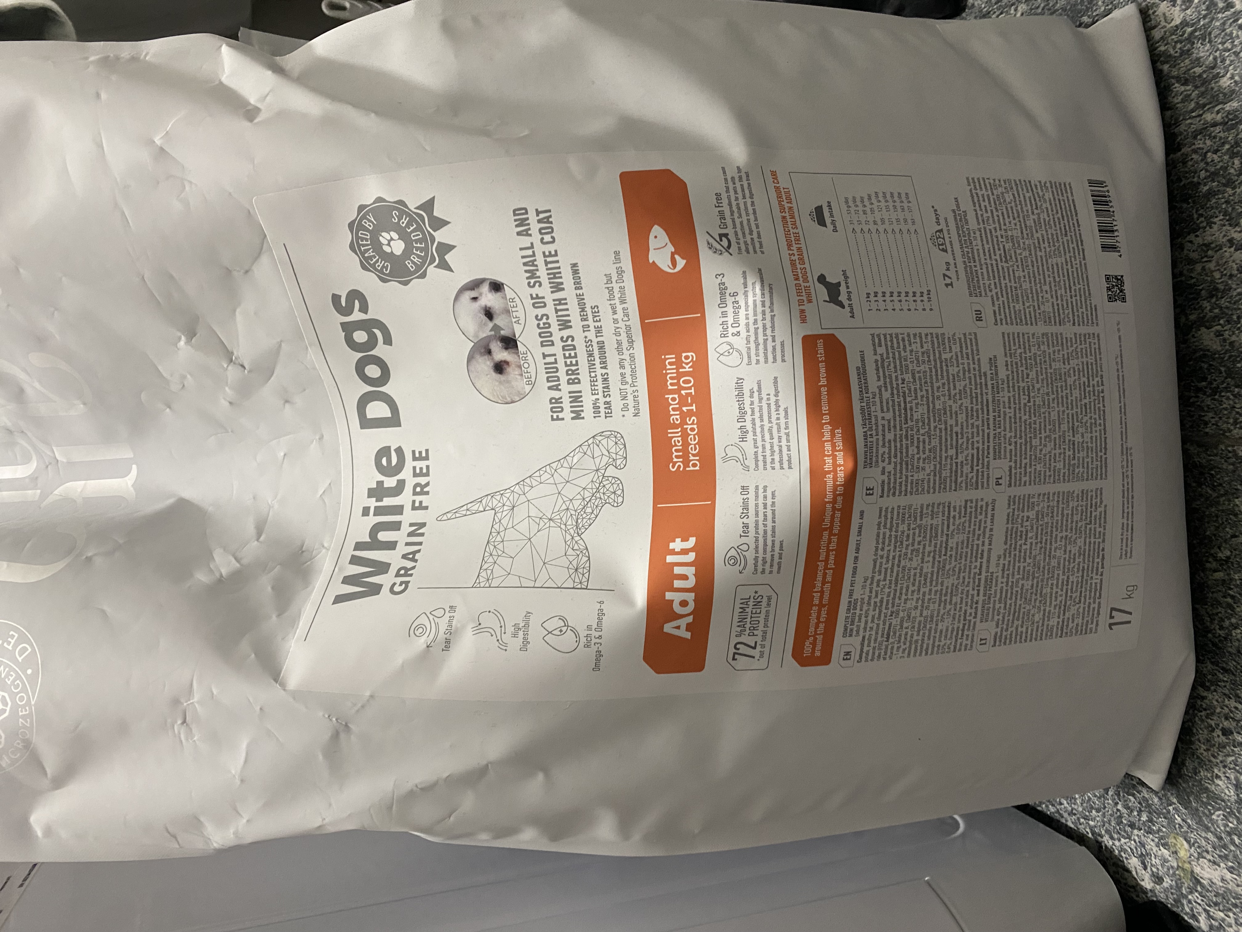 Сухий беззерновий корм Nature's Protection Superior Care з лососем для дорослих собак маленьких і мініатюрних порід із білим забарвленням шерсті – це повноцінний і збалансований корм Супер Преміум сегменту з джерелом білка та сировини найвищої якості, що допомагає боротися з коричневими плямами від сліз та підтримувати шкіру й шерсть здоровими. Корм містить формулу Tear Stains off – ретельно підібраний комплекс амінокислот і добре збалансованих інгредієнтів у складі. Збагачений компонентами, що забезпечують відмінну продуктивність для доброго самопочуття вихованця. Повноцінний склад сухого корму не тільки забезпечить вашого улюбленця всіма необхідними поживними речовинами, але й має відмінні смакові якості та засвоюваність.