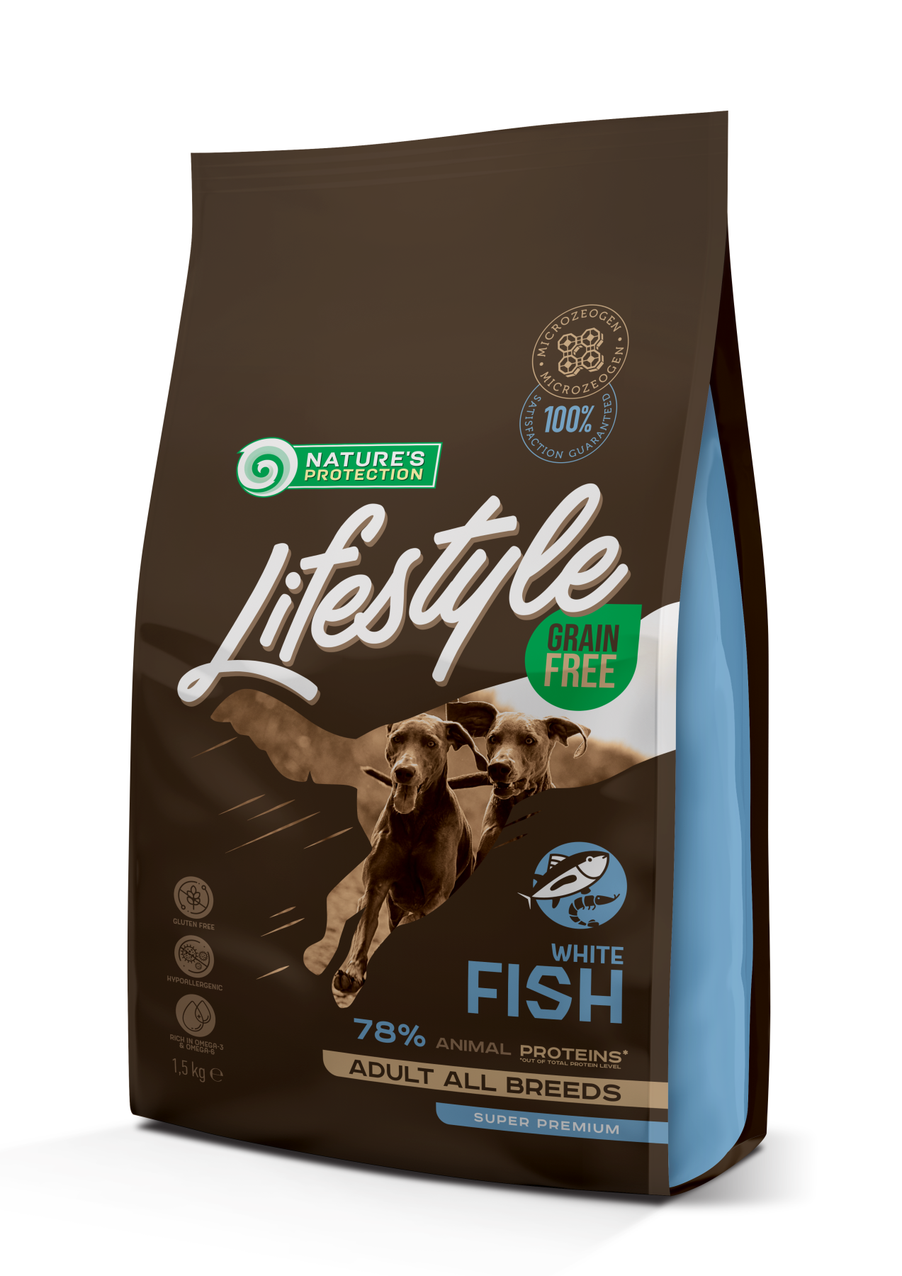 Nature’s Protection Lifestyle Grain Free with White Fish for Adult All Breeds — повнораціонний і збалансований сухий корм для собак супер преміум класу з джерелом білка та сировини найвищої якості. Спеціально розроблений для дорослих собак усіх порід, щоб забезпечити безперебійне травлення. Збагачений інноваційними інгредієнтами, які не містять глютену та ефективні для благополуччя вихованця. Збалансована формула не тільки забезпечить вашого вихованця всіма ефективними поживними речовинами, але також сприяє ідеальній засвоюваності, блискучій шерсті та твердим випорожненням.