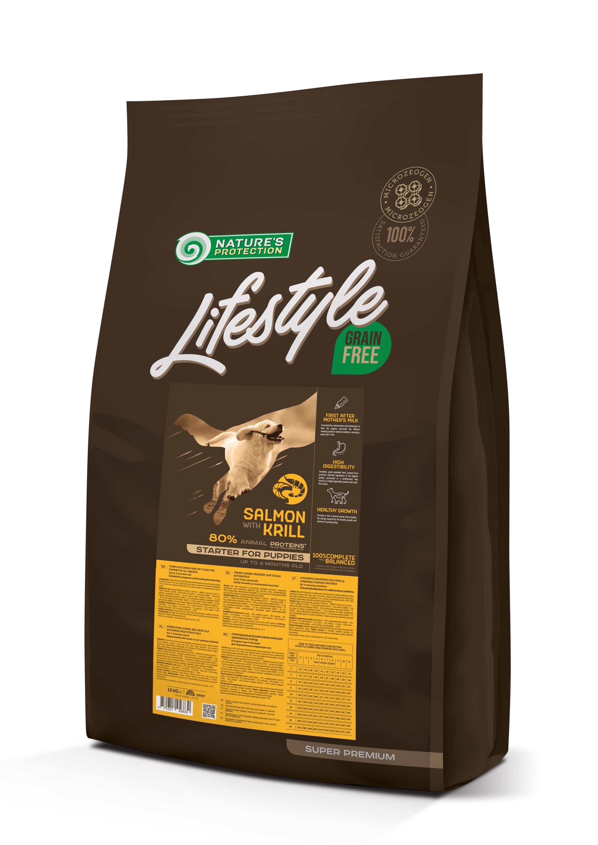 Стартер для цуценят Nature’s Protection Lifestyle без зерна з лососем і крилем – це повноцінний і збалансований сухий корм для собак супер преміум класу з джерелом білка та сировини найвищої якості. Спеціально розроблений для цуценят усіх порід, щоб допомогти подолати важкий період відлучення в оптимальних умовах, гарантуючи хороший початок життя. Склад корму збагачений інноваційними інгредієнтами, які не містять глютену та забезпечують ідеальну ефективність для благополуччя вихованця. Повний склад цього сухого корму для собак підходить не тільки для цуценят, які ростуть, але також для вагітних і годуючих самок, забезпечуючи необхідну енергію для росту і збереження здоров'я.