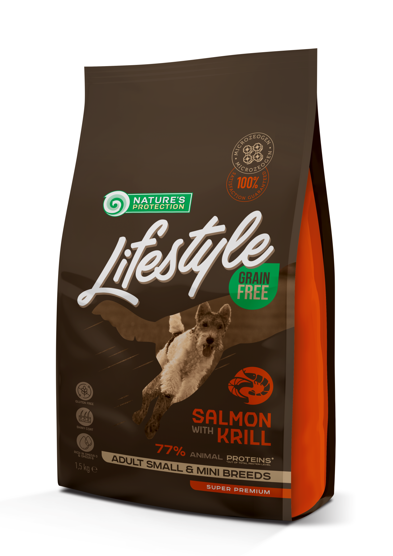 Nature’s Protection Lifestyle Grain Free with Salmon and Krill for Adult Small and Mini Breeds — повнораціонний і збалансований сухий корм для собак супер преміум класу з джерелом білка та сировини найвищої якості. Цей сухий корм спеціально розроблений для дорослих собак дрібних і міні порід, щоб забезпечити безперебійне травлення. Збагачений інноваційними інгредієнтами, які не містять глютену та ефектині для благополуччя вихованця. Формула цього сухого корму не тільки забезпечить вашого вихованця всіма ефективними поживними речовинами, але й сприятиме підтримці здорового стану шкіри та блискучої шерсті.
