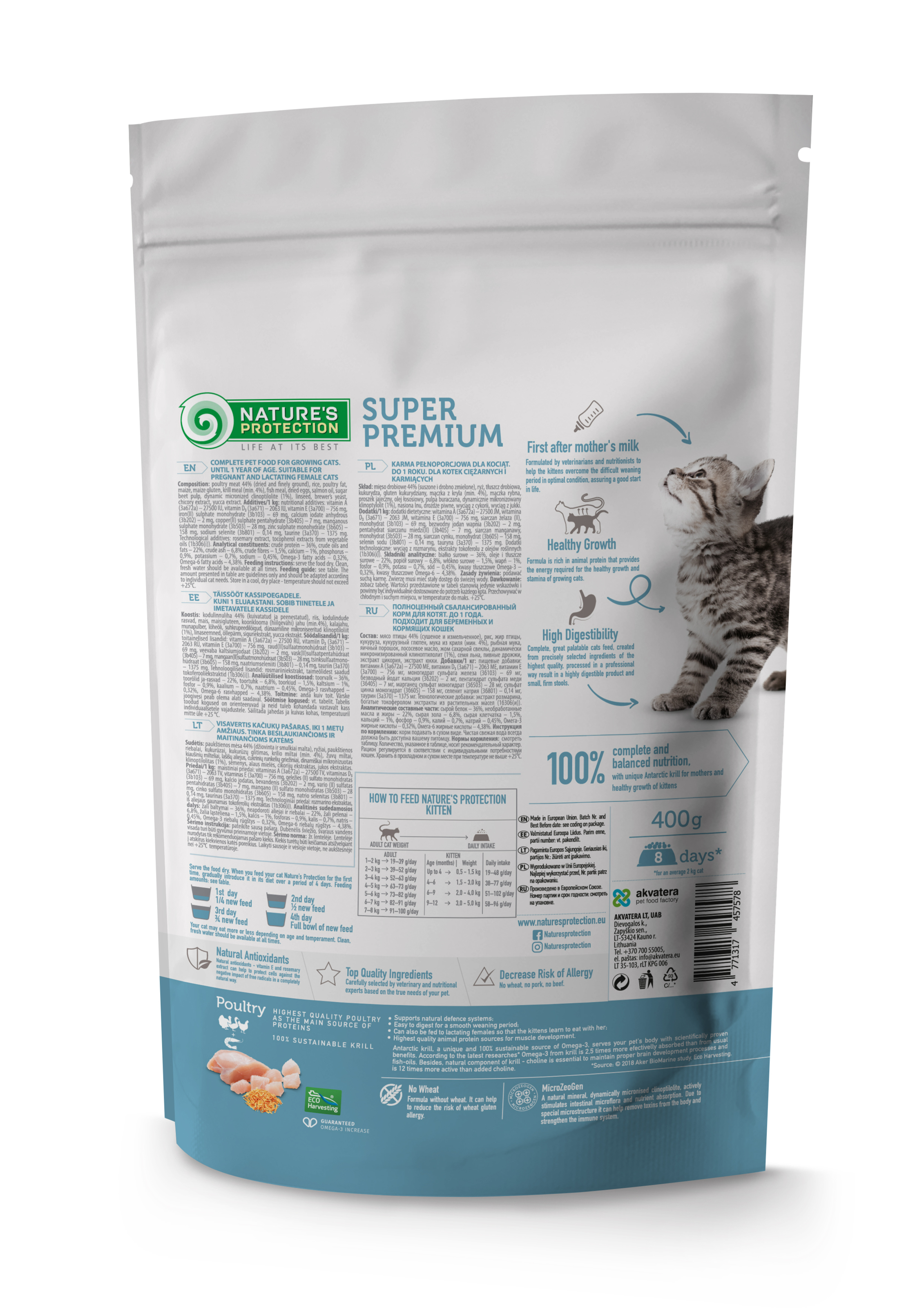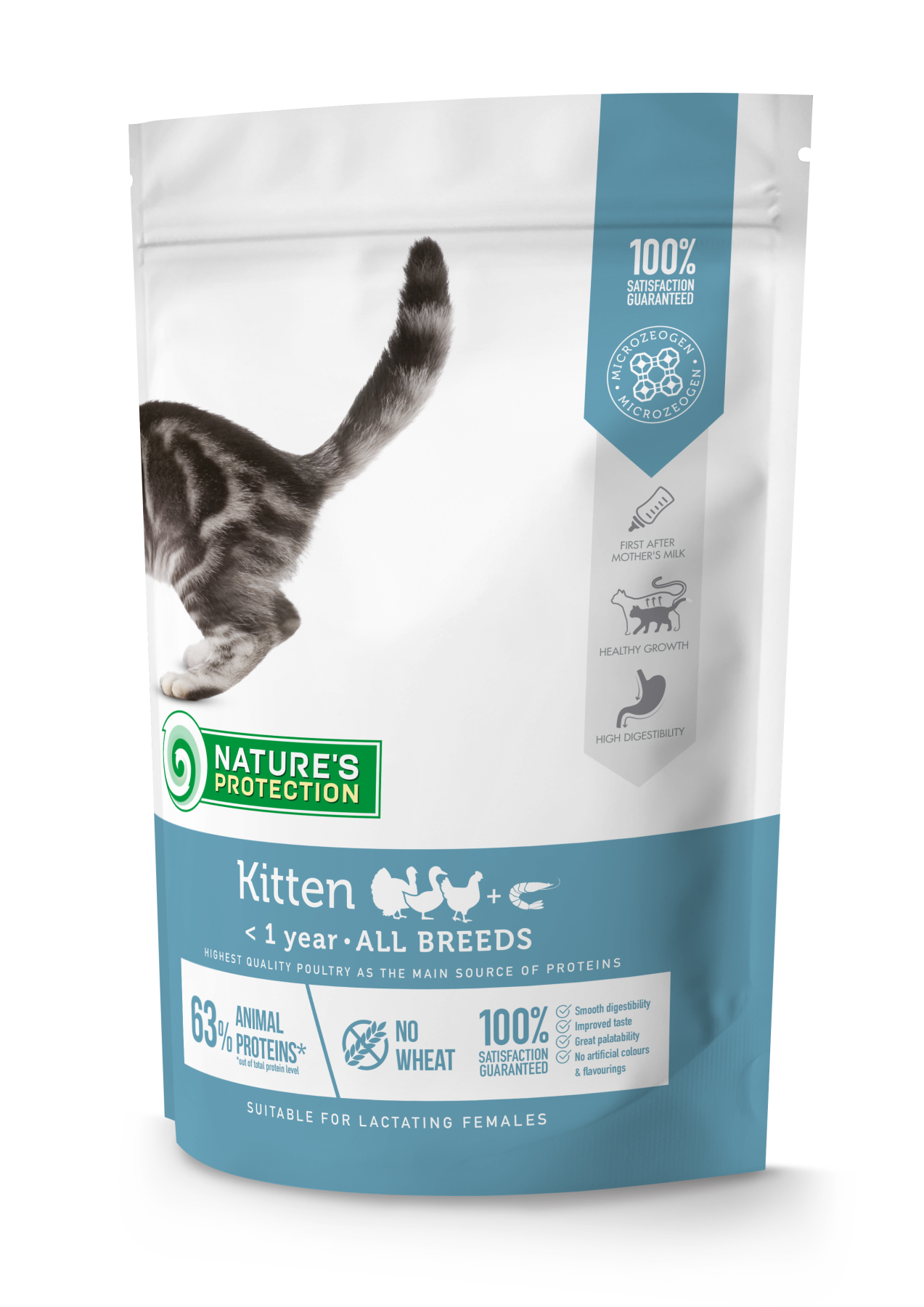 Nature's Protection Kitten з м'ясом птиці та антарктичним крилем для кошенят до 1 року – це повнораціонний збалансований сухий корм супер преміум класу з високоякісними джерелами білка та сировиною. Склад цього сухого корму збагачений інгредієнтами, які ідеально підходять для забезпечення необхідної кількості калорій, вітамінів і мінералів для розвитку та енергії кошеняти. Підходить для лактуючих самок і може використовуватися першим після материнського молока.