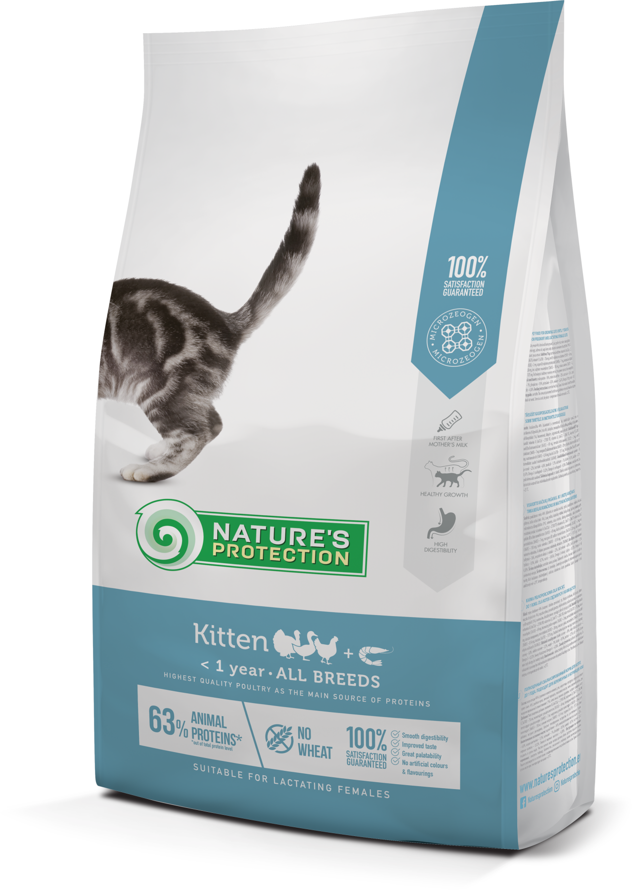 Nature's Protection Kitten з м'ясом птиці та антарктичним крилем для кошенят до 1 року – це повнораціонний збалансований сухий корм супер преміум класу з високоякісними джерелами білка та сировиною. Склад цього сухого корму збагачений інгредієнтами, які ідеально підходять для забезпечення необхідної кількості калорій, вітамінів і мінералів для розвитку та енергії кошеняти. Підходить для лактуючих самок і може використовуватися першим після материнського молока.