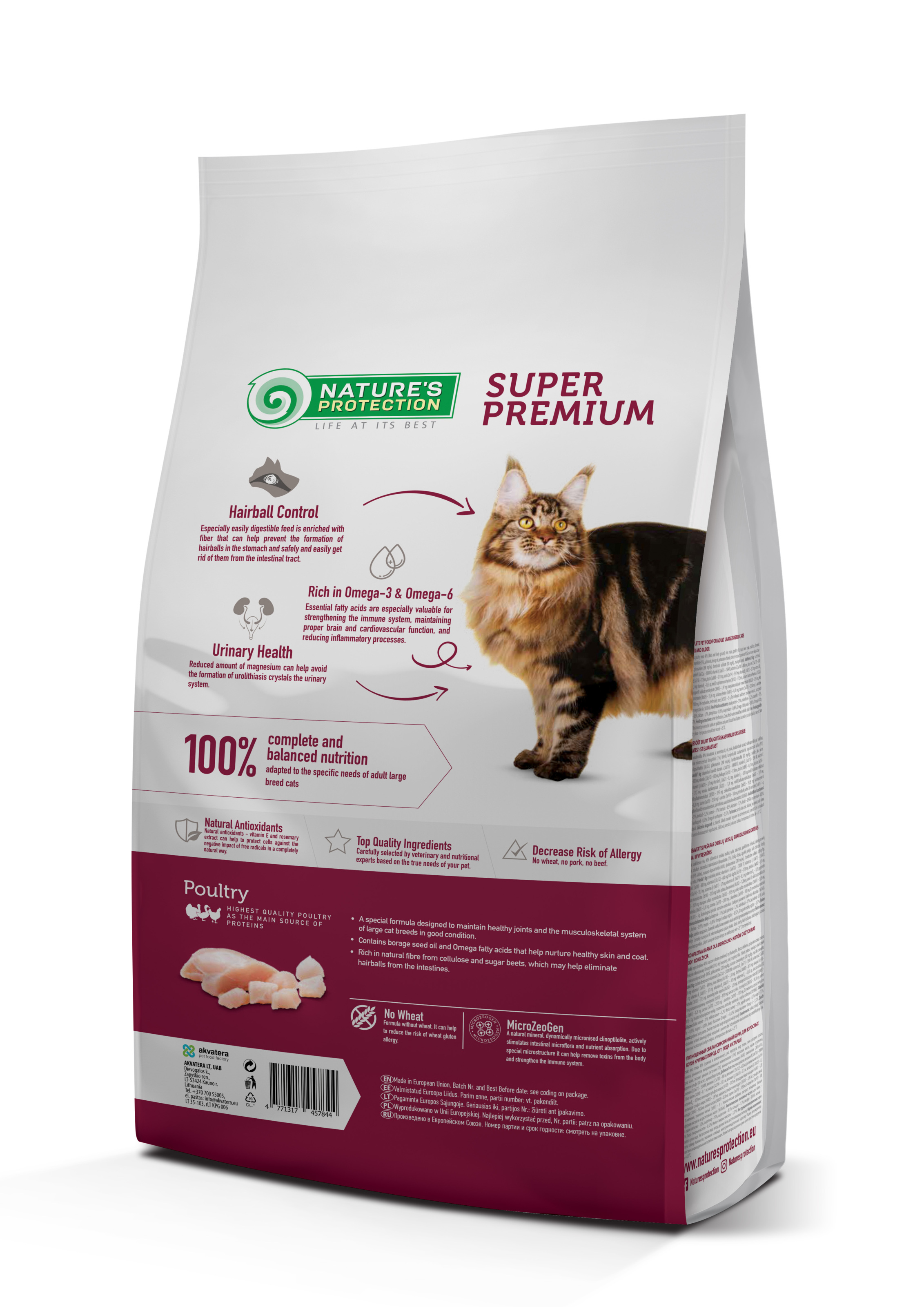 Основним джерелом білка в цьому сухому кормі є м'ясо птиці. Це високоякісний білок, який є чудовим джерелом харчування для котів, адже він насичений необхідними поживними речовинами, що сприяють зміцненню здоров'я. Збалансований склад цього сухого корму збагачений натуральними добавками, такими як MicroZeoGen, які допомагають виводити токсини з організму та підтримувати здорову імунну систему. Корм збагачений жирними кислотами Омега-3 та Омега-6, необхідними для здоров'я шкіри та шерсті. Моно- та поліненасичені жирні кислоти підтримують імунну систему, а насичені жирні кислоти забезпечують необхідною енергією. Цей корм також містить багато клітковини, яка допомагає контролювати утворення грудок шерсті, сприяє здоровому травленню та забезпечує добре загальне самопочуття котів. Всі інгредієнти ретельно підібрані ветеринарними та дієтологічними експертами на основі справжніх потреб вашого улюбленця.