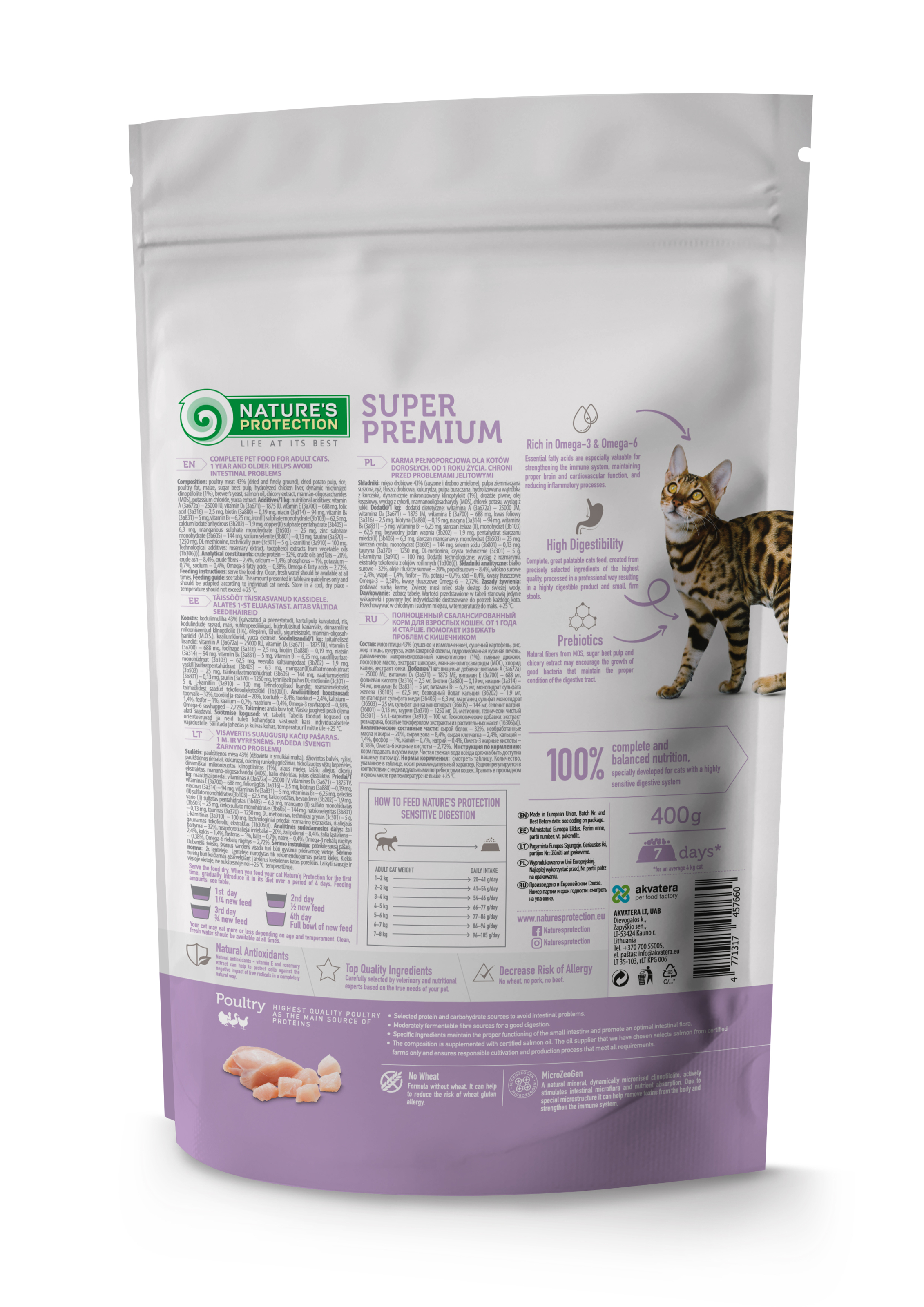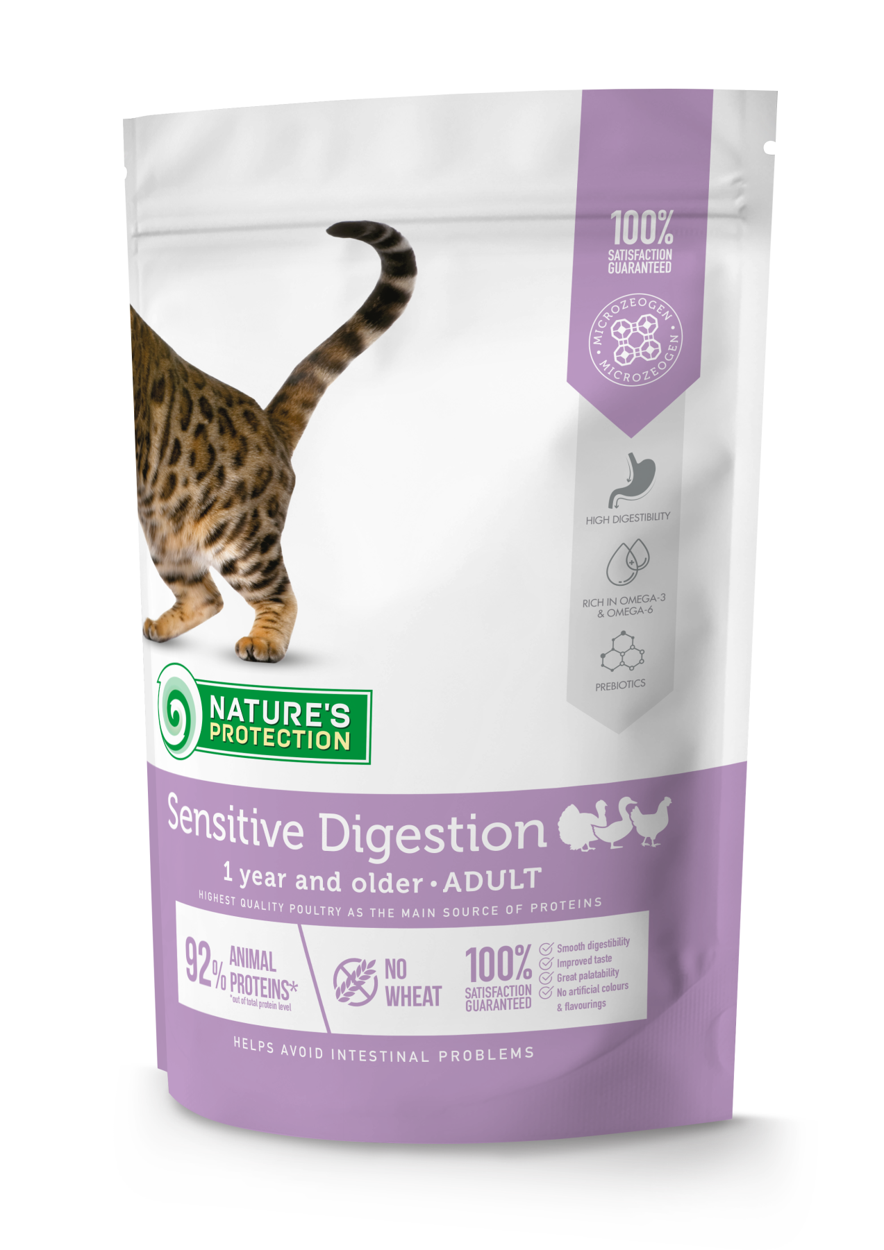 Nature's Protection Sensitive Digestion Adult – повнораціонний, збалансований сухий корм для дорослих котів (від 1 року і старше), що покращує роботу шлунково-кишкового тракту. Легкозасвоюваний корм має приємний для тварин смак.