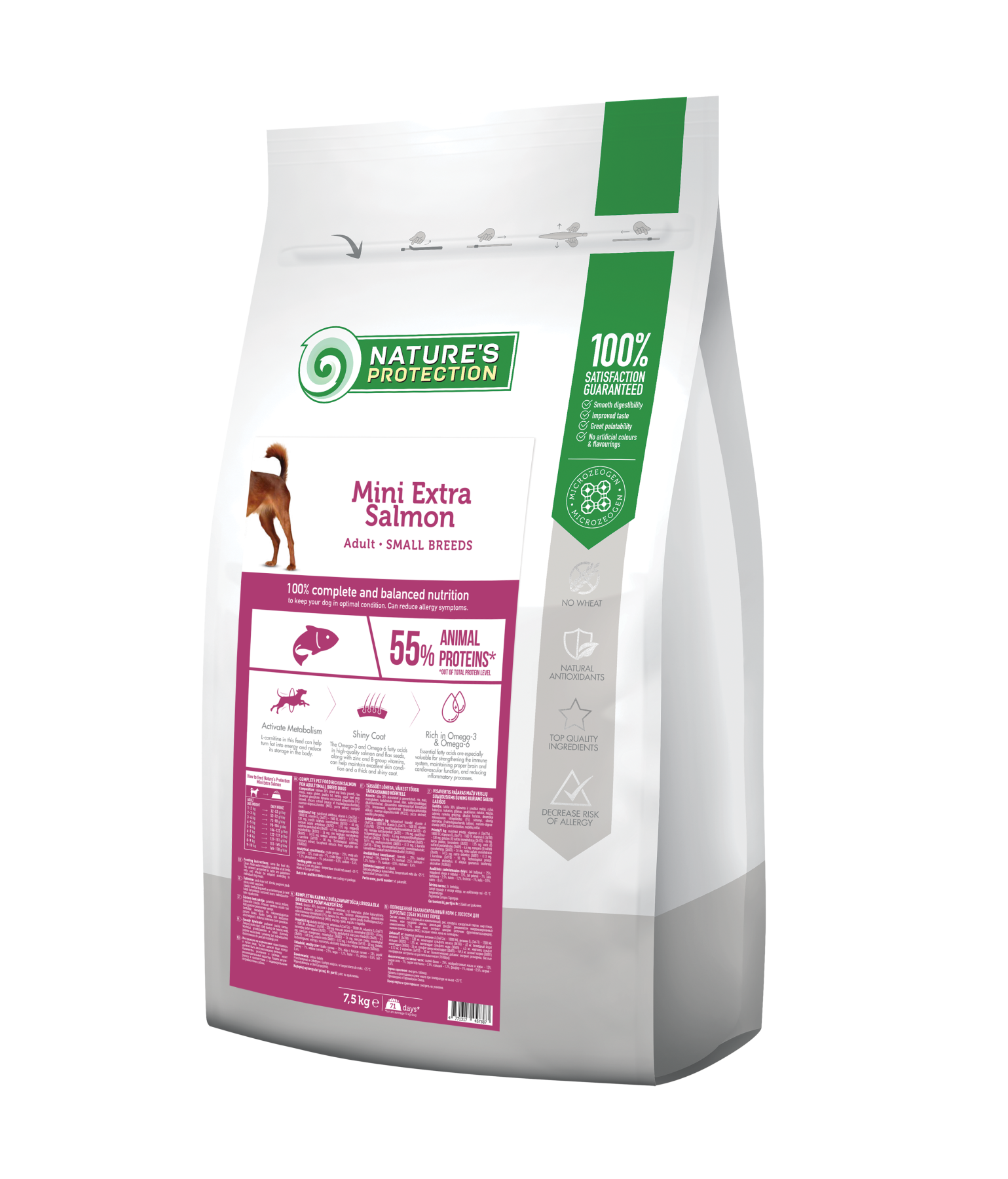 Nature's Protection Mini Extra Salmon for Adult Small Breed Dogs – це повнораціонний збалансований сухий корм супер преміум класу з високоякісними джерелами білка та сировиною. Склад цього сухого корму збагачений інгредієнтами, які ідеально підходять для забезпечення необхідної кількості калорій, вітамінів і мінералів. Повноцінний склад сухого корму не тільки забезпечить вашого улюбленця всіма необхідними поживними речовинами, але й гарантує ідеальну засвоюваність, смакові якості та блискучу шерсть.