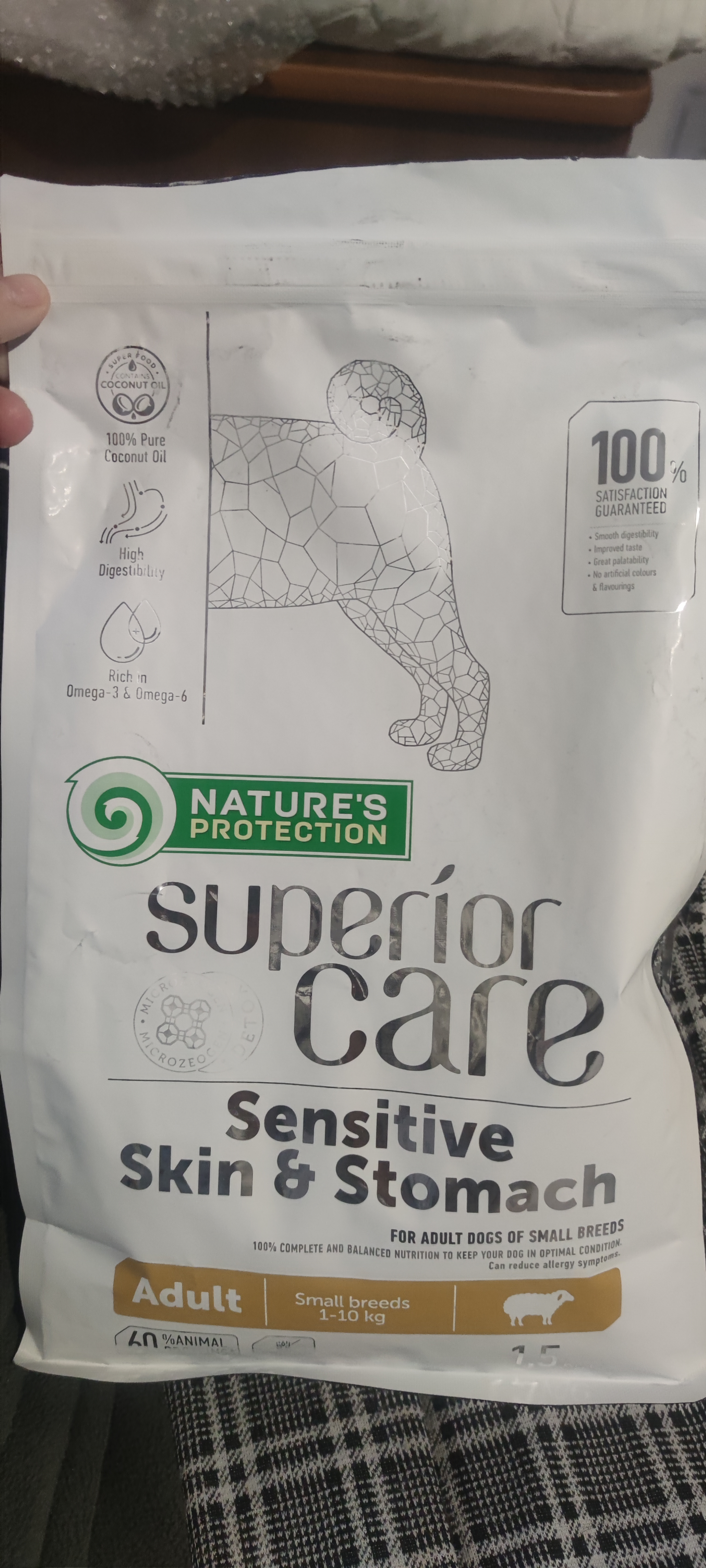 Nature's Protection Superior Care Sensitive Skin&Stomach Grain Free with Lamb для дорослих собак усіх порід – це повнораціонний збалансований сухий корм супер преміум класу з високоякісними джерелами білка та сировиною. Цей повнораціонний сухий корм спеціально розроблений для собак малих порід з особливо чутливою шкірою та травною системою. Він збагачений інгредієнтами, які не подразнюють травну систему і забезпечують ідеальну роботу для гарного самопочуття улюбленця. Повноцінний склад сухого корму не тільки забезпечить вашого улюбленця всіма необхідними поживними речовинами, але й гарантує ідеальну засвоюваність та смакові якості.