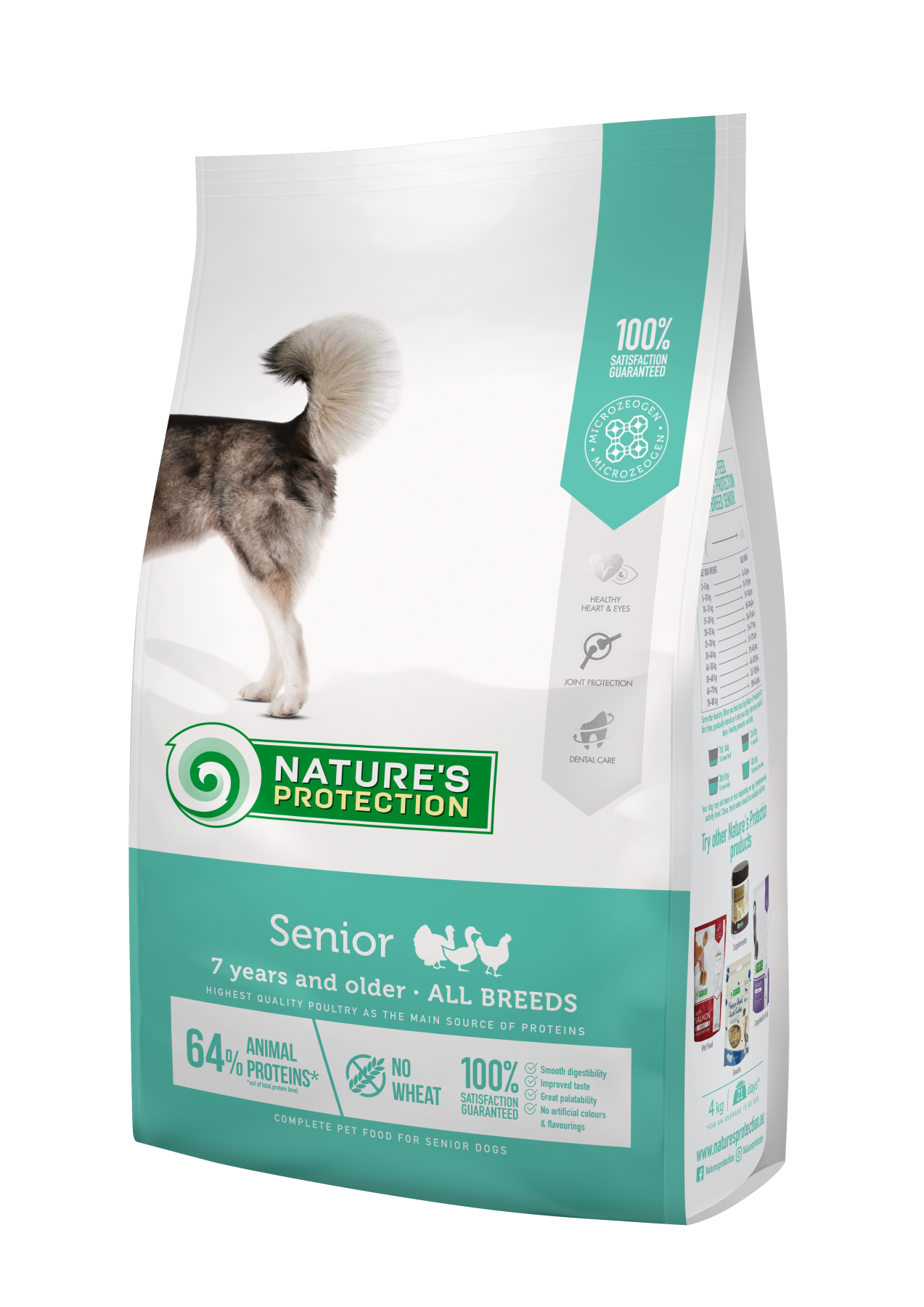 Сухий корм Nature's Protection Senior для літніх собак усіх порід створений з інгредієнтів, які ідеально підходять для забезпечення необхідної кількості калорій, вітамінів і мінералів для потреб літніх собак.
