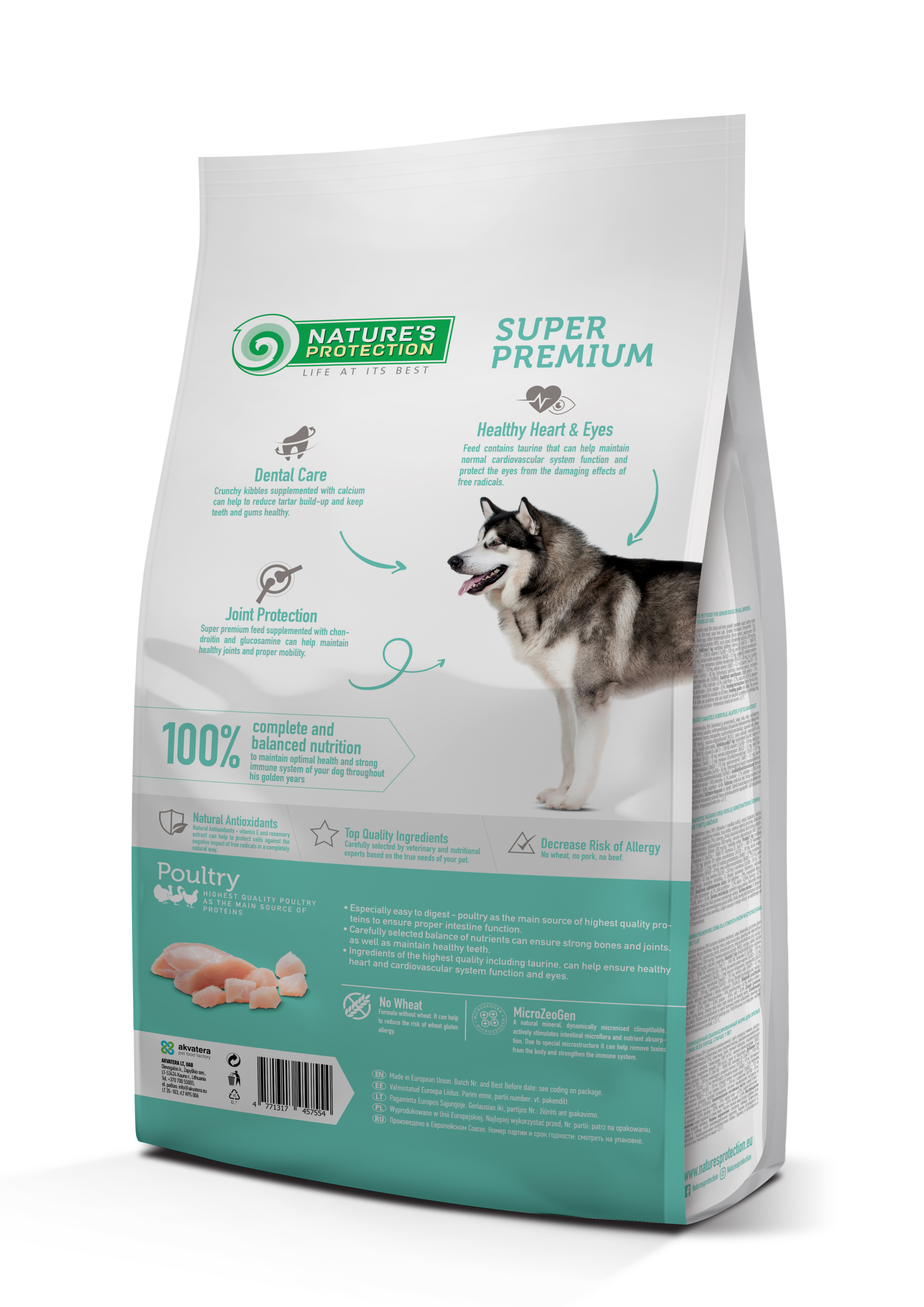 Nature's Protectio Senior for 7 years and older All Breed Dogs with Poultry — це повнораціонний і збалансований сухий корм для собак супер преміум класу з джерелом протеїну найвищої якості та сировиною. Склад цього сухого корму збагачений інгредієнтами, які ідеально підходять для забезпечення необхідної кількості калорій, вітамінів і мінералів. Повноцінний сухий корм для собак не тільки забезпечить вашого улюбленця всіма корисними поживними речовинами, але й збереже міцність кісток і суглобів.