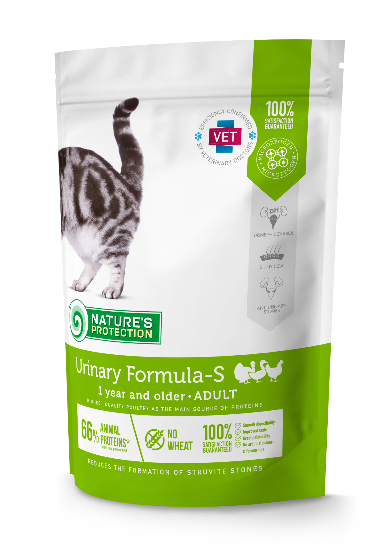 Nature's Protection Urinary Formula-S для кішок від 1 року з м'ясом птиці – це повнораціонний і збалансований сухий корм супер преміум класу з джерелом протеїну та сировини найвищої якості. До складу цього сухого корму для котів входять інгредієнти, які ідеально підходять для забезпечення необхідної кількості калорій, вітамінів і мінералів для підтримки здоров’я сечовивідних шляхів, особливо для вихованців, схильних до утворення струвітних каменів у сечовому міхурі.