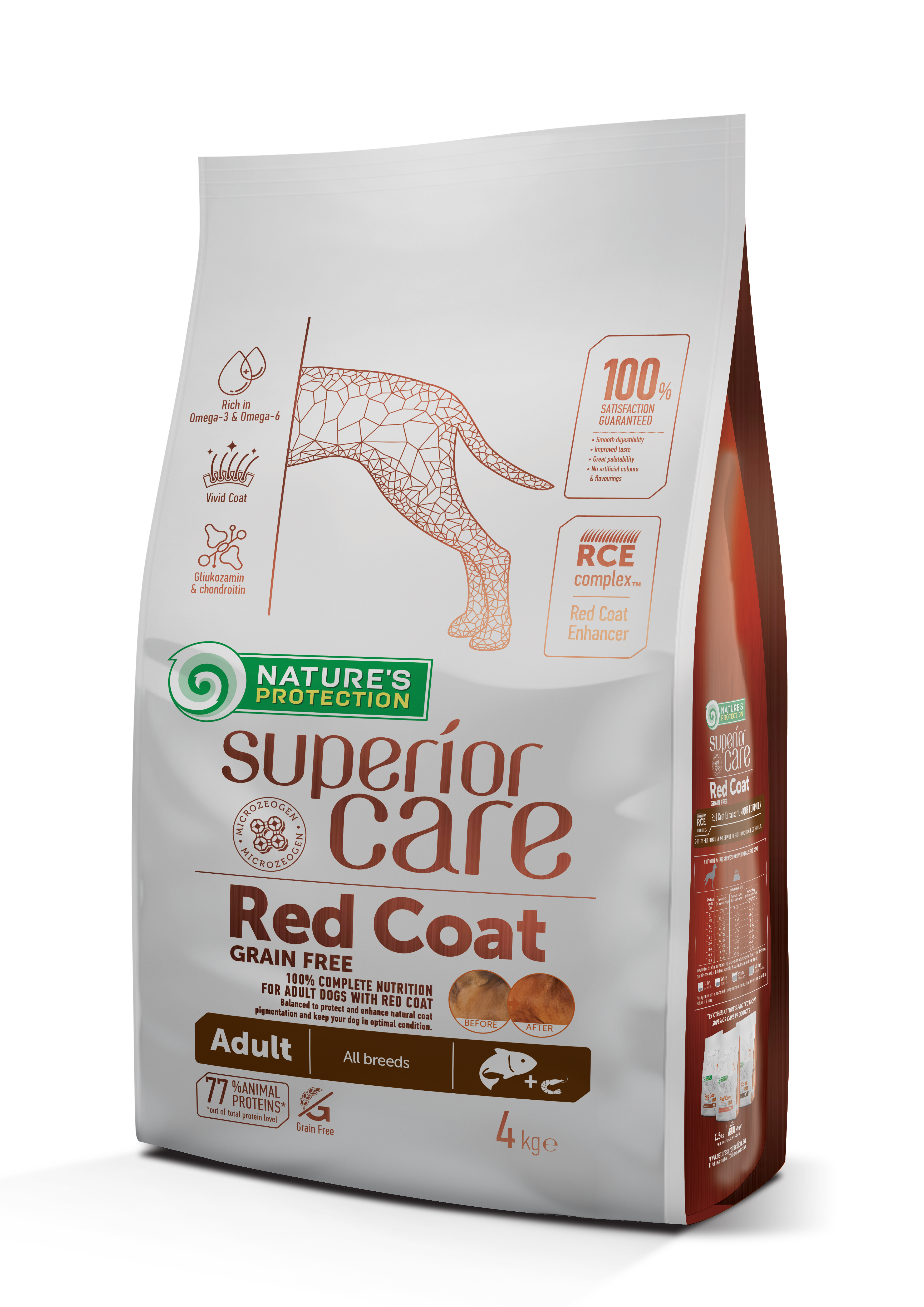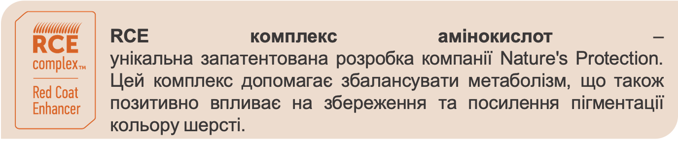 Відновити та зберегти яскравість кольору, забезпечити появу нової здорової шерсті допоможе спеціалізований корм для рудих та коричневих собак NP Superior Care Red Coat з унікальним запатентованим амінокислотним комплексом RCE ( абревіатура RCE розшифровується як Red Coat Enhancer або Підсилювач Червоного Кольору).