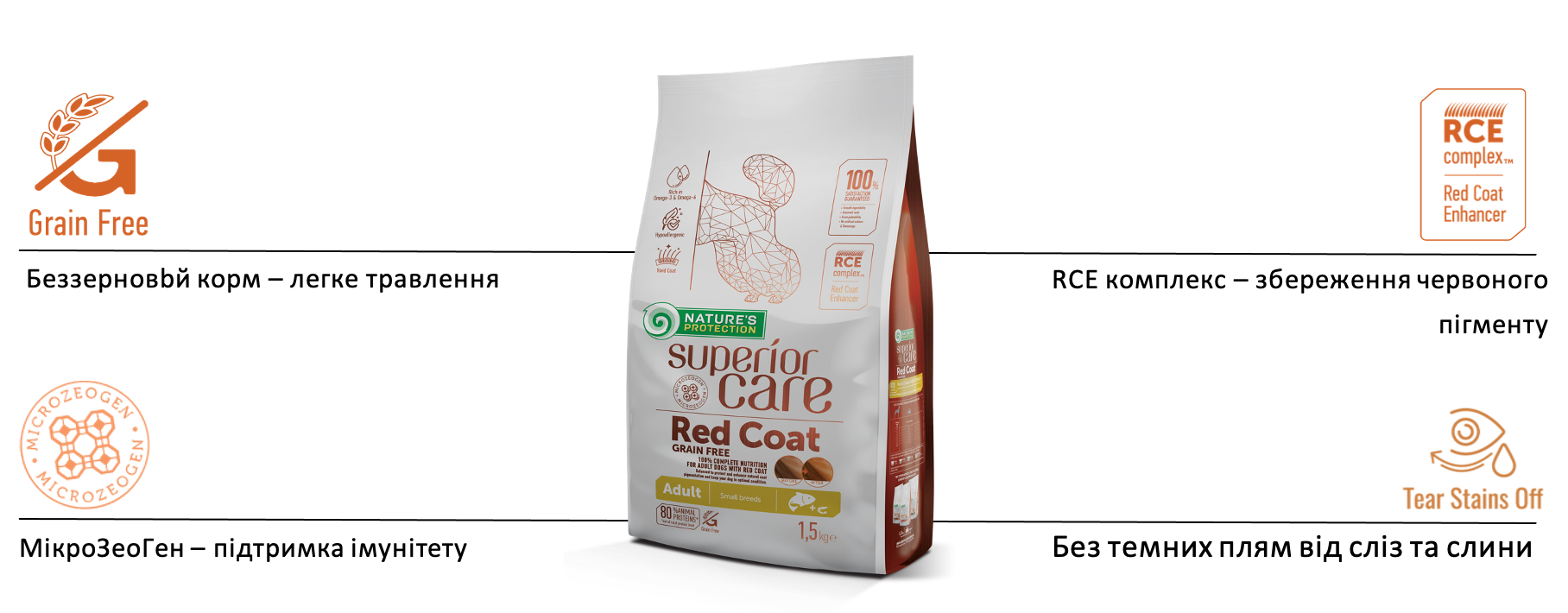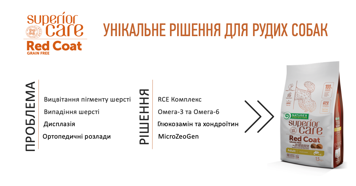 Також сухі корми для рудих собак Superior Care Red Coat мають ряд інших функціональних переваг: