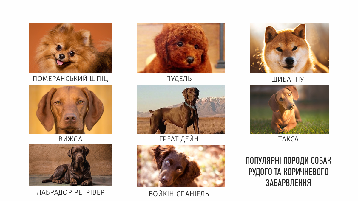 Руді та коричневі собаки завжди привертають увагу та викликають емоції у прохожих. Так зване, «червоне» забарвлення шерсті охоплює цілу гаму кольорів, від блискучого золотистого відтінку з глибокими помаранчевими або каштановими відтінками до іржавого або печінково-червоного. А також існує багато варіацій, в яких ці кольори змішуються з іншими, наприклад чорним та білим.