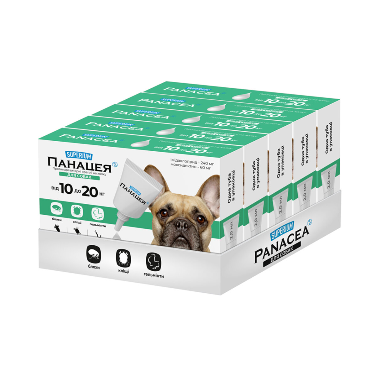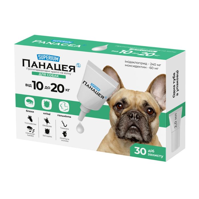SUPERIUM Панацея – комплексні протипаразитарні краплі для собак вагою від 10 до 20 кг. Забезпечують захист від 26 видів паразитів протягом 30 діб. Ефективні для лікування та профілактики ураження блохами та їх личинками, вошами, волосоїдами, вушними та підшкірними кліщами, а також гельмінтами (нематодами).