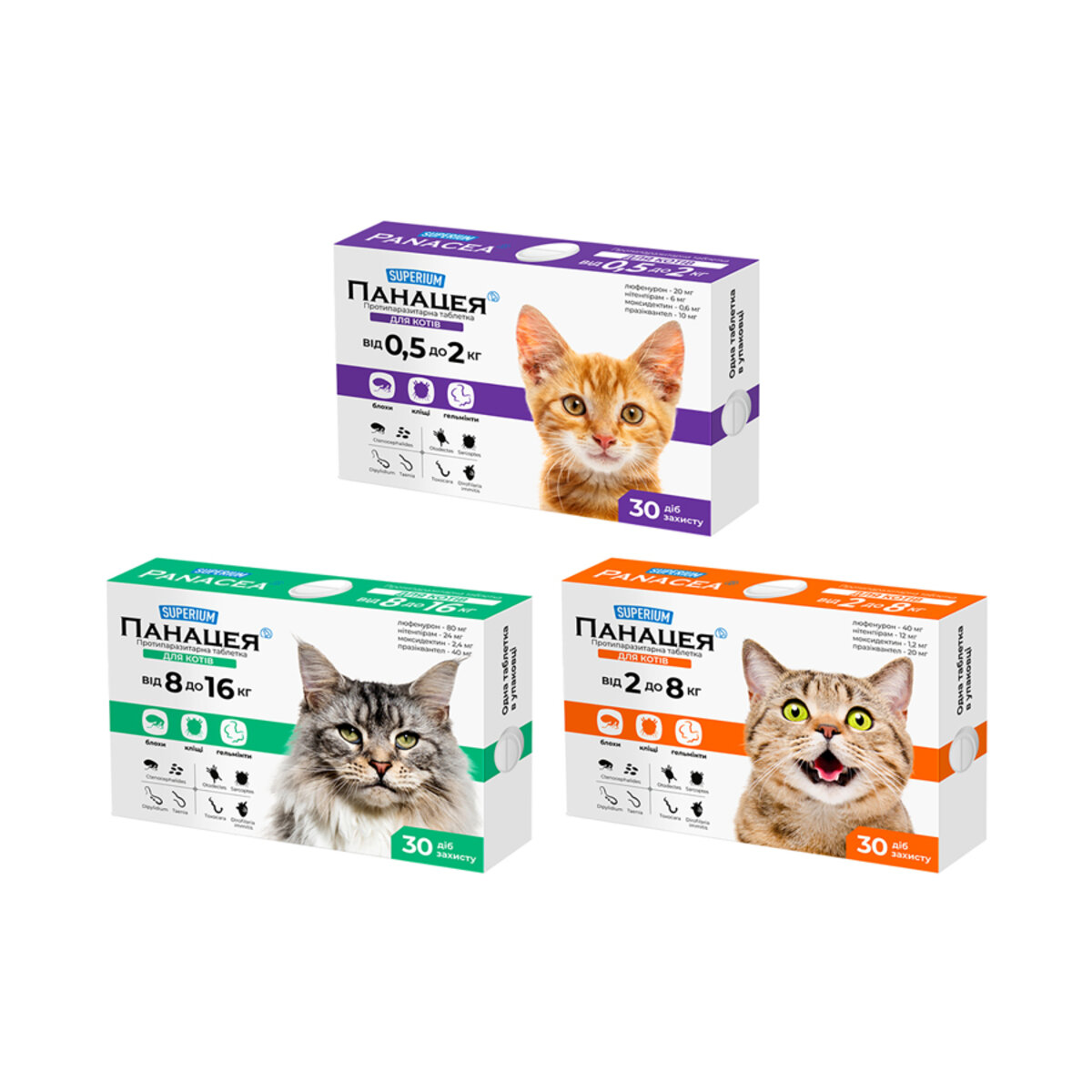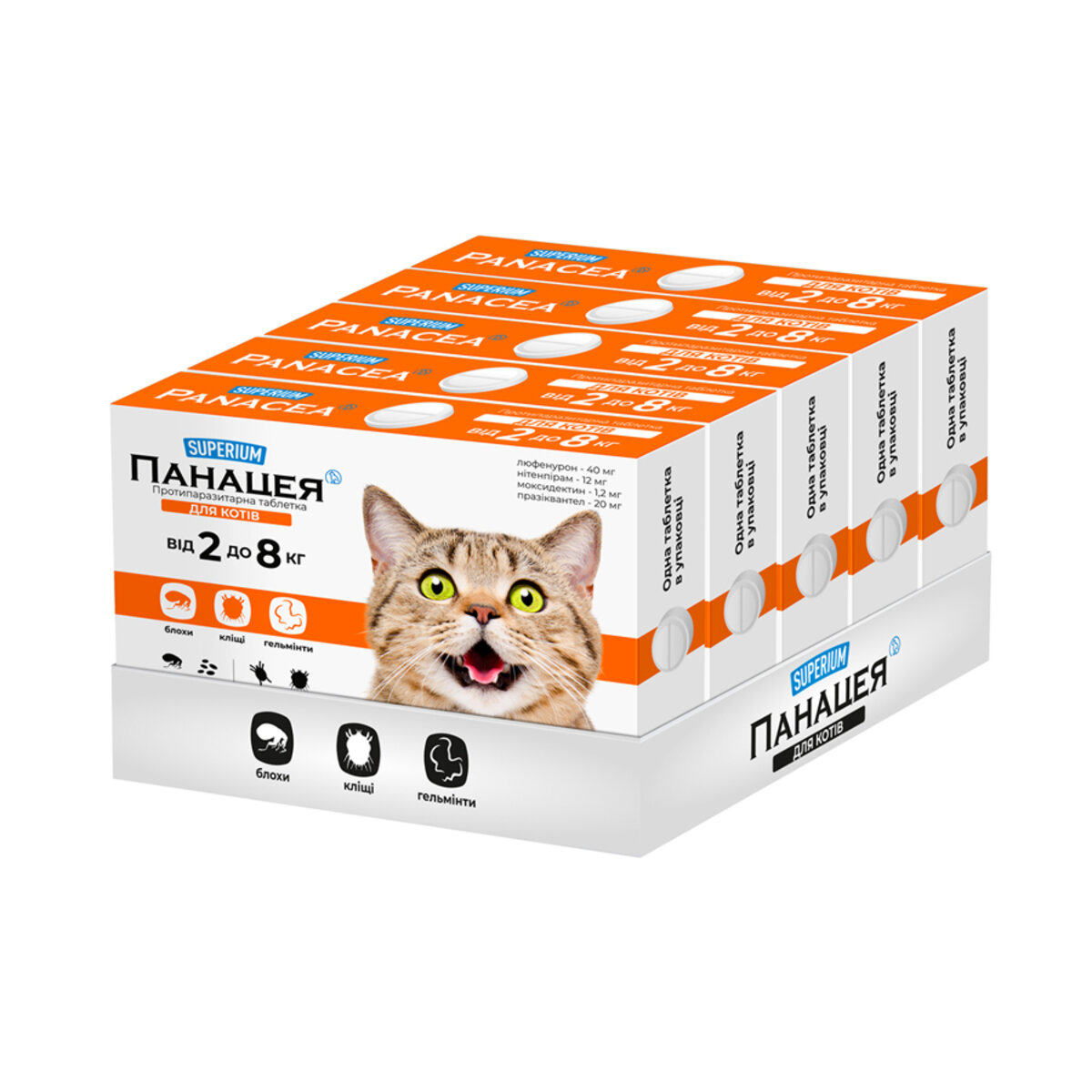 SUPERIUM Панацея – протипаразитарний засіб у формі таблетки, розроблений для комплексного захисту котів від зовнішніх і внутрішніх паразитів. Забезпечує системну дію та може застосовуватись для регулярної профілактики і лікування інвазій.